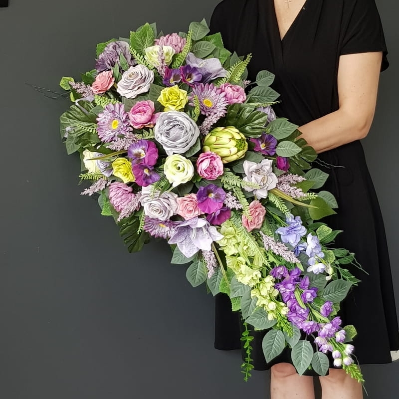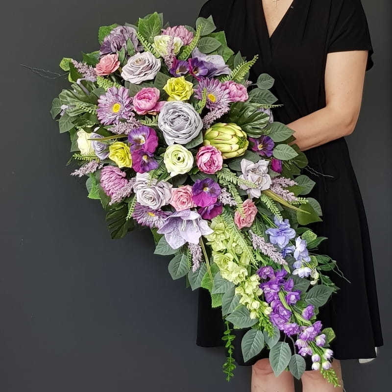 Oryginalna kompozycja nagrobna w kształcie wydłużonej kropli, wykonana z wysokiej jakości roślin sztucznych w letnich kolorach.