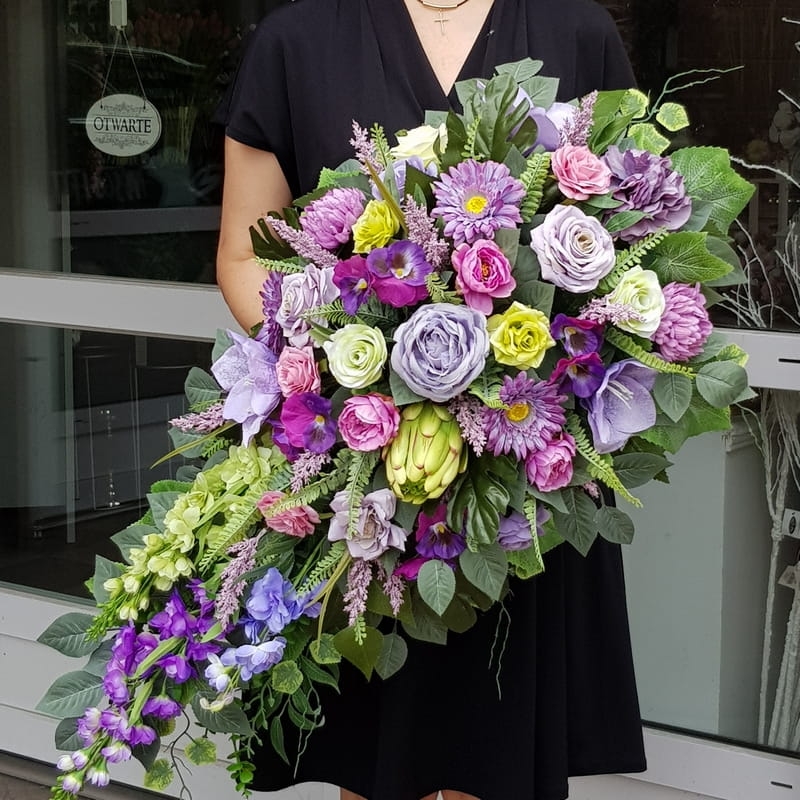 Piękna i oryginalna dekoracja jest doskonałą formą wyrażenia pamięci o bliskich. Wyszukana forma, najwyższej jakości kwiaty i perfekcyjne zestawienie kolorów sprawiają, że doskonale prezentuje się na nagrobkach.