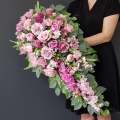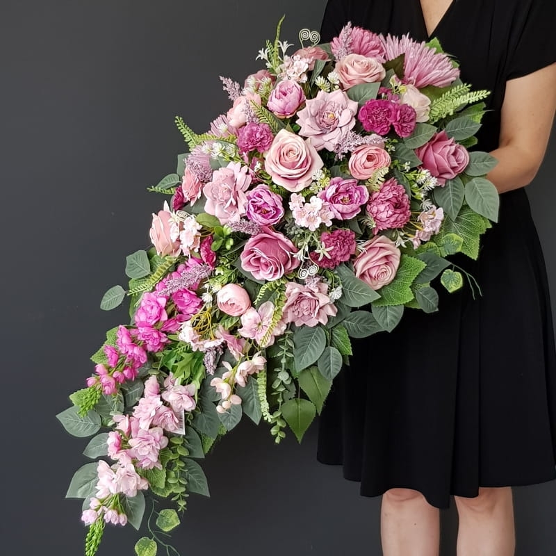 Oryginalna kompozycja nagrobna w kształcie wydłużonej kropli, wykonana z wysokiej jakości roślin sztucznych w letnich kolorach.