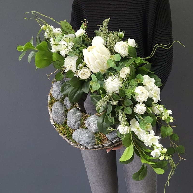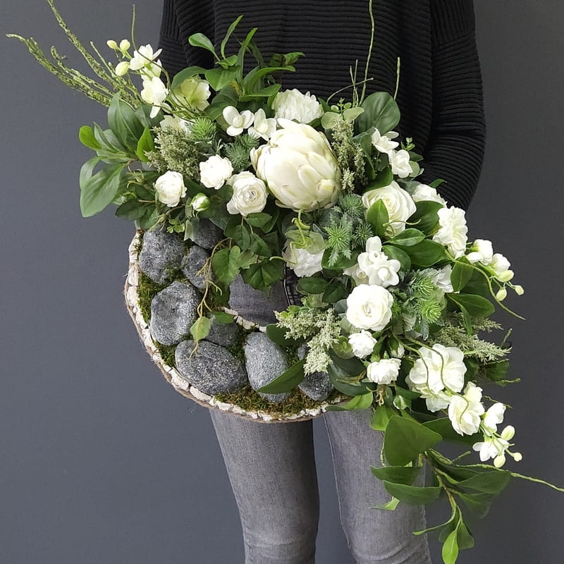 Oryginalna dekoracja nagrobna w stonowanej kolorystyce i asymetrycznej formie, gotowa do położenia na płytę nagrobkową. Całość osadzona w obciążonej cementem donicy z kory. Kompozycja jest stworzona z dbałością o najdrobniejszy szczegół. Wszystkie elementy są idealnie dopasowane kolorystycznie tak, aby tworzyły spójną całość. Poszczególne kompozycje mogą minimalnie różnić się rozkładem i rodzajami kwiatów, w zależności od dostępności, jednak kolorystyka i efekt końcowy są zawsze zachowane.