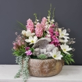 Oryginalna kompozycja nagrobna, wykonana z wysokiej jakości roślin sztucznych oraz donicy metalowej wysokiej jakości, obciążona.