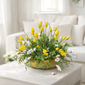 Realistyczne tulipany o delikatnie wyprofilowanych płatkach i naturalnie układających się łodygach zostały wzbogacone różnorodną zielenią dekoracyjną, która nadaje aranżacji lekkości i organicznego charakteru. Złota misa na stabilnej podstawie dodaje kompozycji elegancji oraz sprawia, że całość prezentuje się luksusowo i efektownie. To gotowa dekoracja, która nie wymaga pielęgnacji, a przez cały rok zachowuje swój świeży i estetyczny wygląd. Doskonale sprawdzi się jako ozdoba: Polecamy do domów prywatnych, ale również do obiektów użyteczności publicznej. Nasze kompozycje to wspaniałe uzupełnienie hotelowych i restauracyjnych wnętrz, recepcji, a także salonów spa, gabinetów kosmetycznych i lekarskich, klinik i poradni.