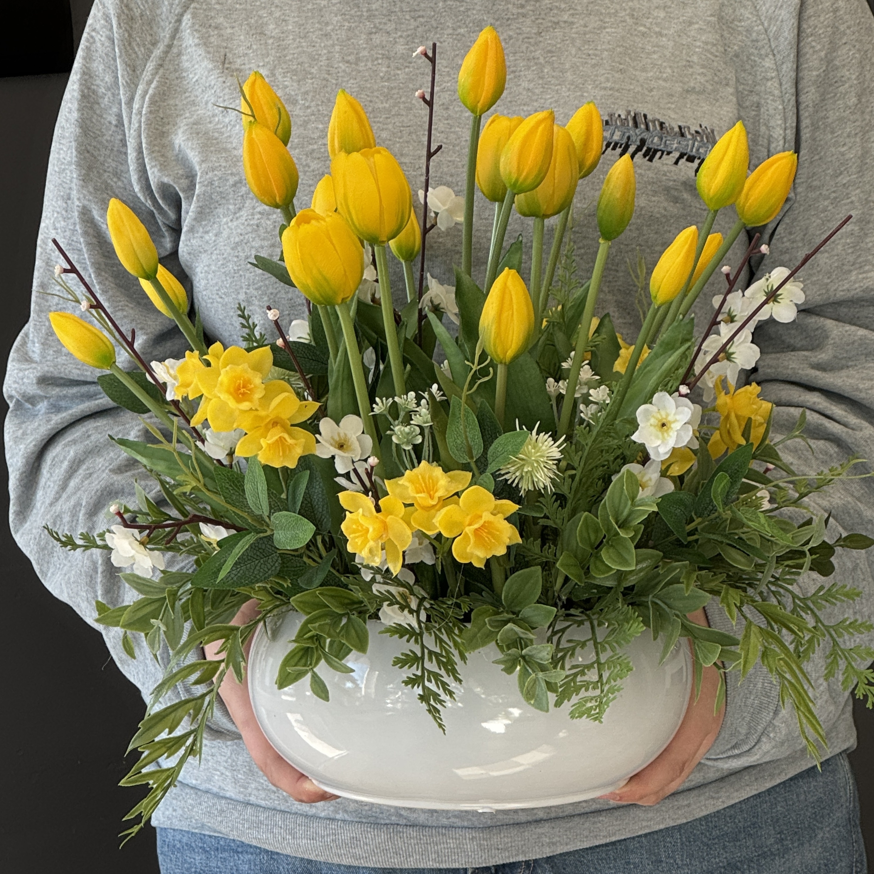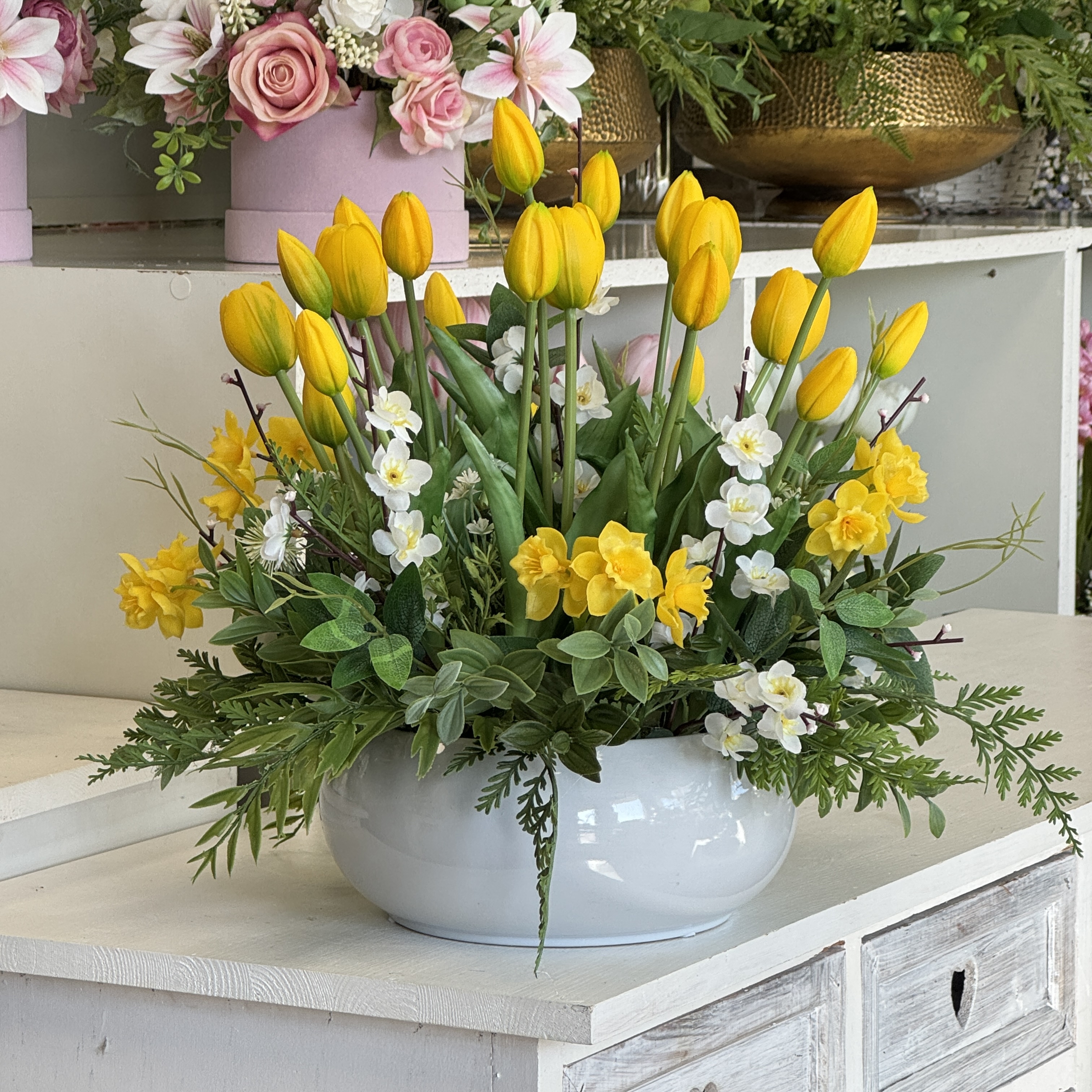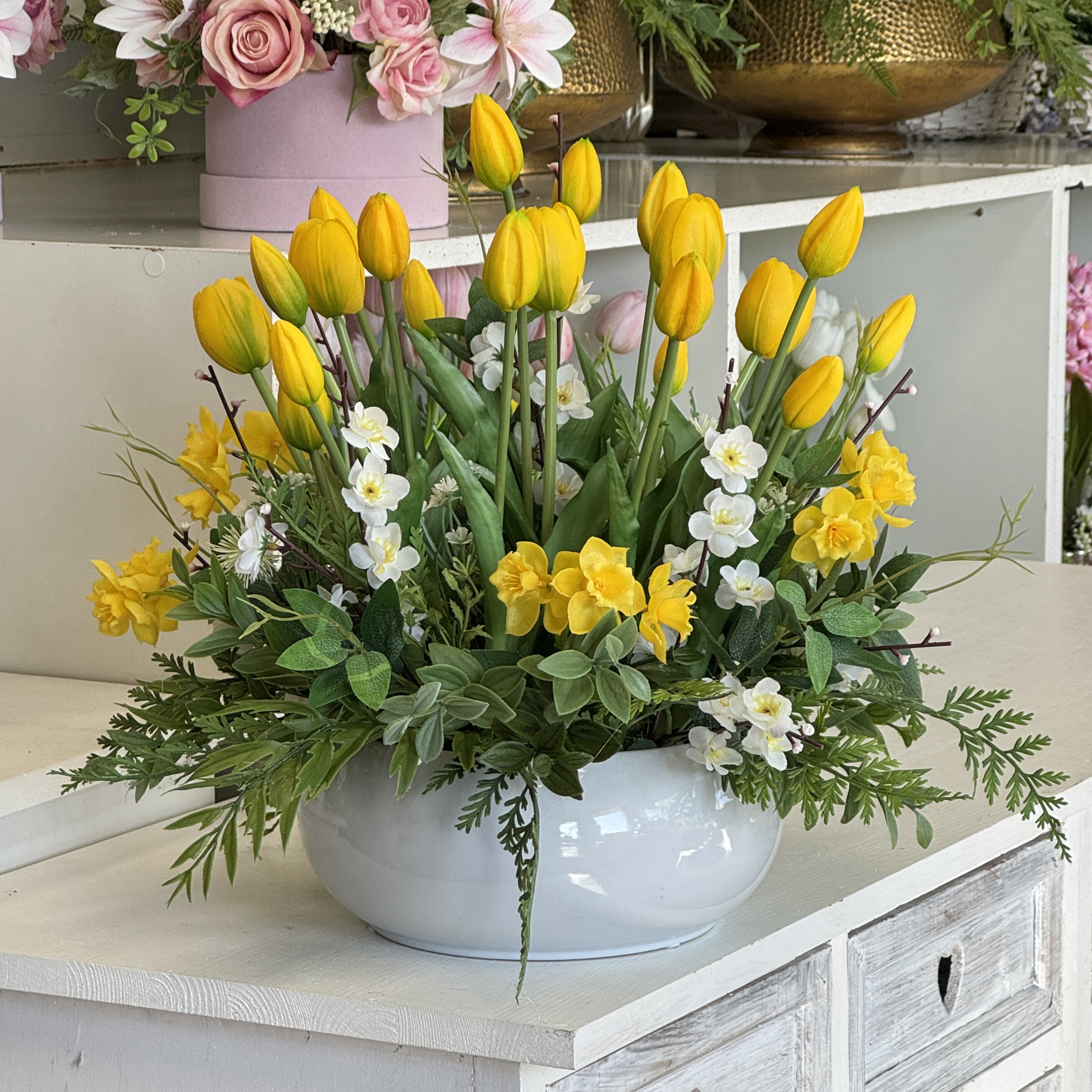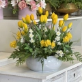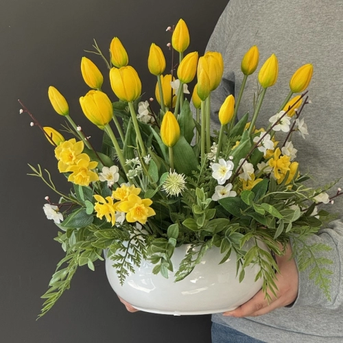 Realistyczne tulipany o delikatnie wyprofilowanych płatkach i naturalnie układających się łodygach zostały wzbogacone różnorodną zielenią dekoracyjną, która nadaje aranżacji lekkości i organicznego charakteru. Złota misa na stabilnej podstawie dodaje kompozycji elegancji oraz sprawia, że całość prezentuje się luksusowo i efektownie. To gotowa dekoracja, która nie wymaga pielęgnacji, a przez cały rok zachowuje swój świeży i estetyczny wygląd. Doskonale sprawdzi się jako ozdoba: Polecamy do domów prywatnych, ale również do obiektów użyteczności publicznej. Nasze kompozycje to wspaniałe uzupełnienie hotelowych i restauracyjnych wnętrz, recepcji, a także salonów spa, gabinetów kosmetycznych i lekarskich, klinik i poradni.