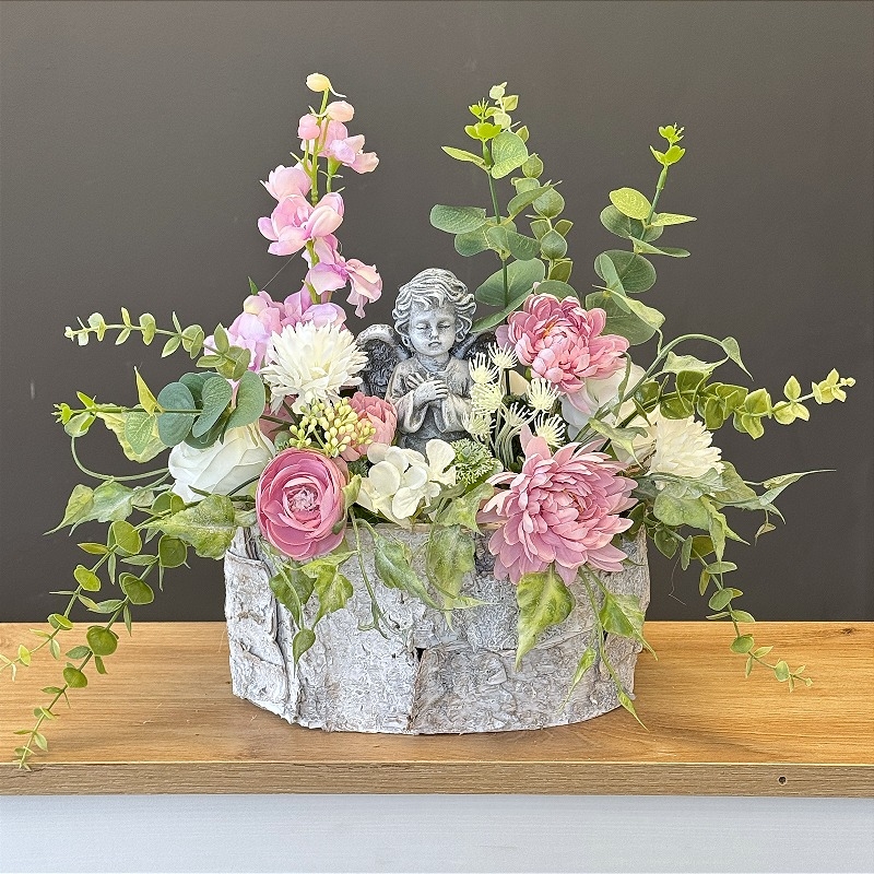 Delikatne piwonie, róże i chryzantemy z najwyższej jakości sztucznych kwiatów tworzą harmonijną całość, która oddaje ciepło, miłość i pamięć rodziców oraz bliskich. Uzupełnieniem kompozycji są zielone liście i naturalna osłonka o fakturze kory drzewa, nadająca całości spokojny, naturalny charakter. Dekoracja „Mały Aniołek” to wzruszający symbol pamięci i hołdu dla córeczki, która na zawsze pozostanie w sercach rodziny jako ukochane dziecko i niebiański promień światła.