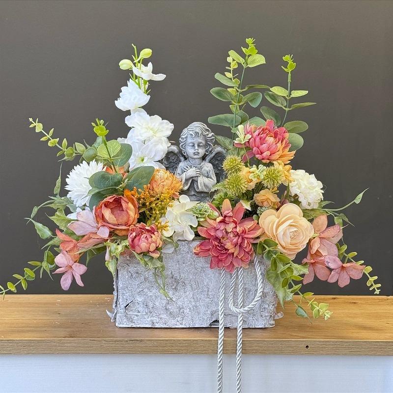 Złociste i pomarańczowe chryzantemy, jasnobrązowe akcenty oraz kremowe dodatki tworzą harmonijną całość, oddającą piękno jesiennej natury. Całość dopełniają ozdobne liście i gałązki, które przywołują wspomnienie jesiennego ogrodu pełnego spokoju. Kompozycja osadzona jest w osłonce o naturalnym charakterze, dzięki czemu nabiera wyjątkowej elegancji i subtelności. „Jesienny Aniołek” to dekoracja pełna symboliki – wyraz pamięci, miłości i czułości, która pozostaje z bliskimi na zawsze.