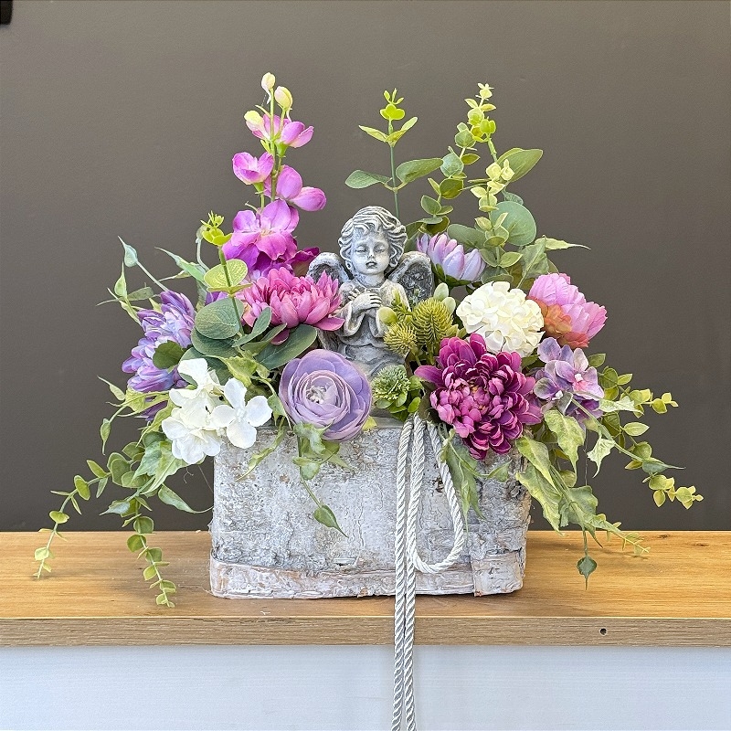 Delikatna i subtelna dekoracja nagrobna z aniołem stworzona z myślą o najmłodszych. Kompozycja łączy stonowane odcienie fioletu z delikatnym różem, tworząc harmonijną i pełną ciepła całość. W bukiecie zastosowano wysokiej jakości sztuczne kwiaty o naturalnym wyglądzie, w tym drobne różowe róże, fioletowe hortensje oraz delikatne akcenty eukaliptusa, które nadają kompozycji lekkości i elegancji.