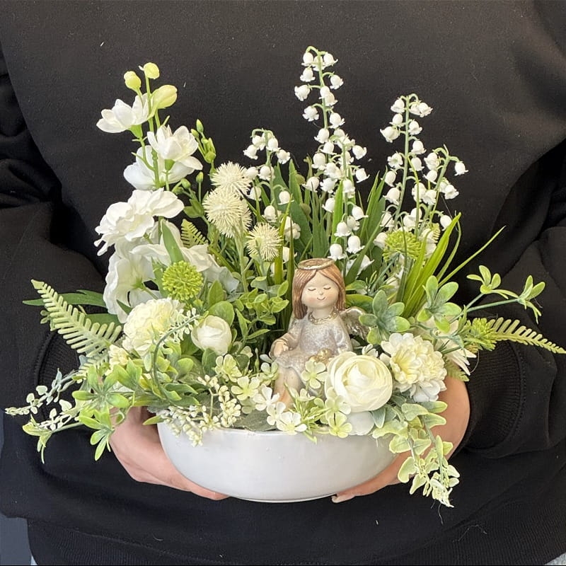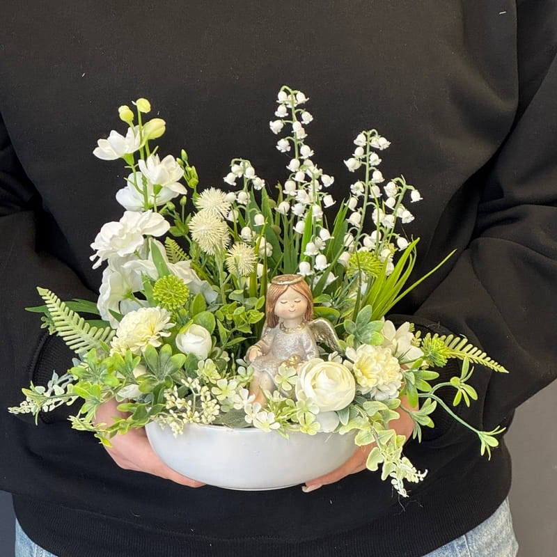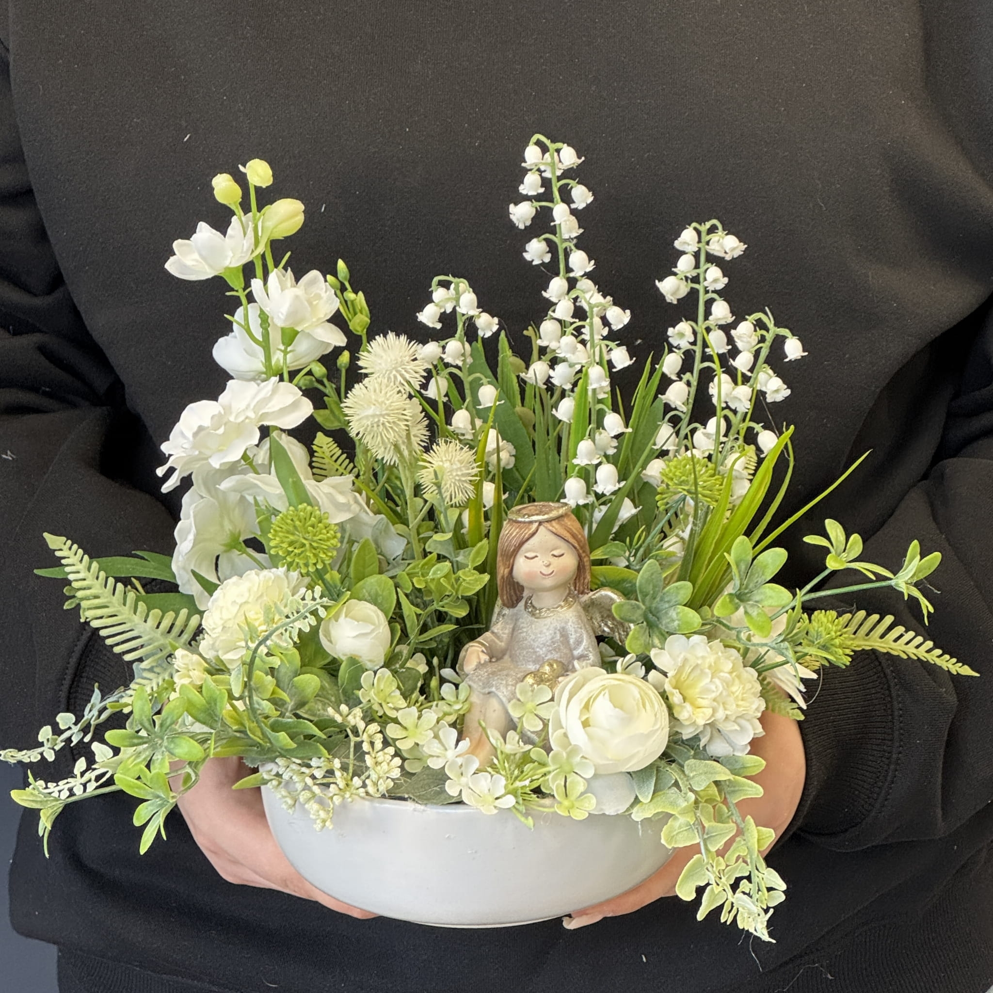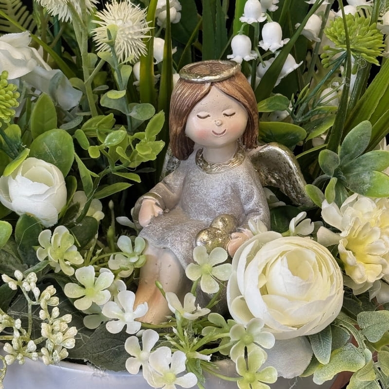 Subtelna i oryginalna kompozycja na dziecięcy nagrobek została wykonana z sercem w toruńskiej pracowni florystycznej. Stroik został osadzony w ceramicznej donicy, by zapewnić trwałość i harmonię formy. W centralnej części została umieszczona figurka aniołka – dziewczynki, symbol opieki, niewinności i niegasnącej troski.