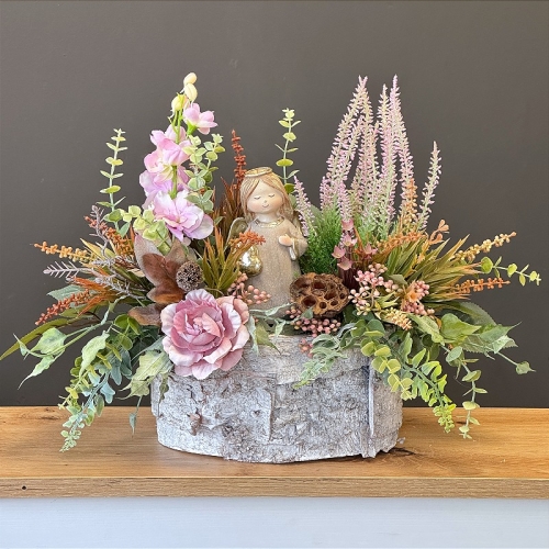 Delikatna i subtelna dekoracja nagrobna z aniołem stworzona z myślą o najmłodszych. Kompozycja łączy stonowane odcienie różu z bielą w odcieniu śmietankowym, tworząc harmonijną i pełną ciepła całość. W bukiecie zastosowano wysokiej jakości sztuczne kwiaty o naturalnym wyglądzie, w tym drobne różowe róże, hortensje oraz delikatne akcenty eukaliptusa, które nadają kompozycji lekkości i elegancji.