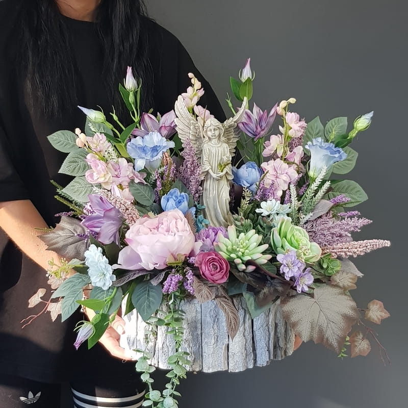Dekoracja funeralna z aniołkiem osadzona w drewnianej donicy obłożonej korą. Postawa jest obciążona cementem, wypełniona dużą ilością kwiatów, liści i roślinnych dodatków w przepięknej, stonowanej kolorystyce. Szczególnego uroku dodaje jej przepiękny anioł umieszczony w kompozycji.