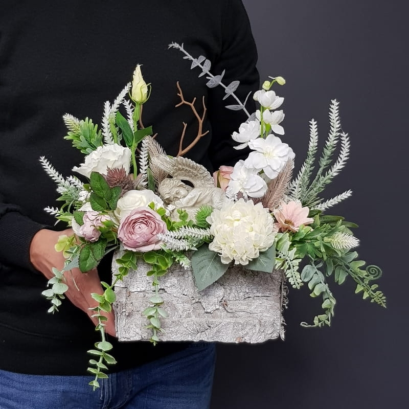 Dekoracja funeralna z aniołkiem osadzona w drewnianej donicy obłożonej korą. Postawa jest obciążona cementem, wypełniona dużą ilością kwiatów, liści i roślinnych dodatków w przepięknej, stonowanej kolorystyce. Szczególnego uroku dodaje jej przepiękny anioł umieszczony w kompozycji.
