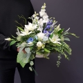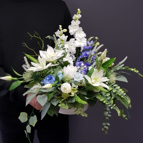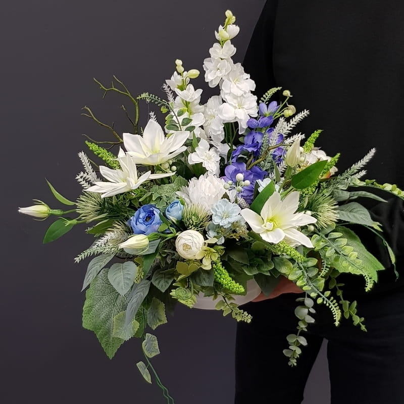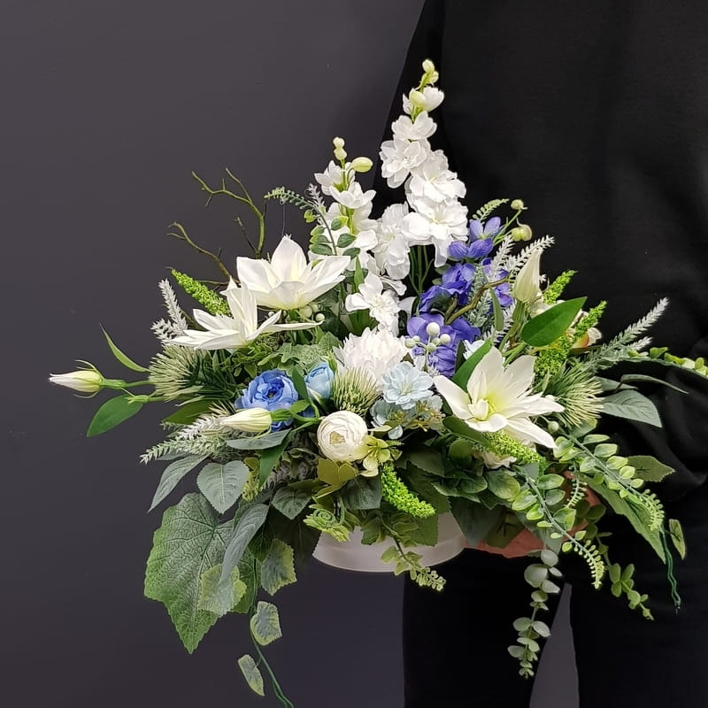 Dekoracja funeralna w niskiej donicy w biało-niebieskiej kolorystyce. Postawa jest obciążona cementem, wypełniona dużą ilością kwiatów, liści i roślinnych dodatków w przepięknej, stonowanej kolorystyce.