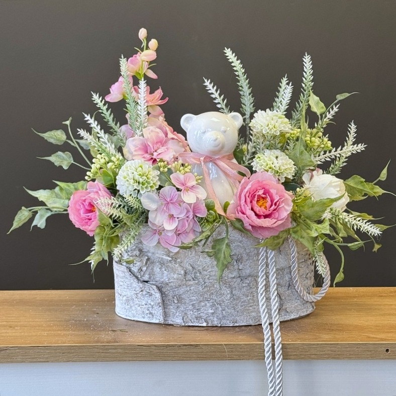 Delikatna i subtelna dekoracja nagrobna stworzona z myślą o najmłodszych. Centralnym punktem aranżacji jest figurka misia – symbol utraconego dzieciństwa, beztroski i niewinności – otoczona kwiatami w pastelowej kolorystyce. Kompozycja łączy stonowane odcienie kwiatów tworząc harmonijną i pełną ciepła całość. W stroiku zastosowano wysokiej jakości sztuczne kwiaty o naturalnym wyglądzie, w tym drobne róże, mini peonie, hortensje oraz delikatne akcenty eukaliptusa, które nadają kompozycji lekkości i elegancji.