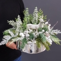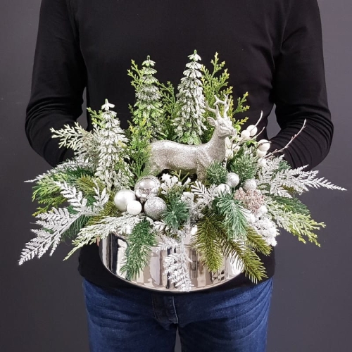 Oryginalna, zimowa kompozycja dekoracyjna wykonana z wysokiej jakości roślin sztucznych oraz figurek, umieszczona w ceramicznej donicy. Całość jest wykonana z dbałością o najdrobniejszy szczegół. Rośliny i dodatki są dopasowane kolorystycznie tak, aby tworzyły spójną całość. Idealna do mieszkania, na prezent lub do sesji fotograficznych.