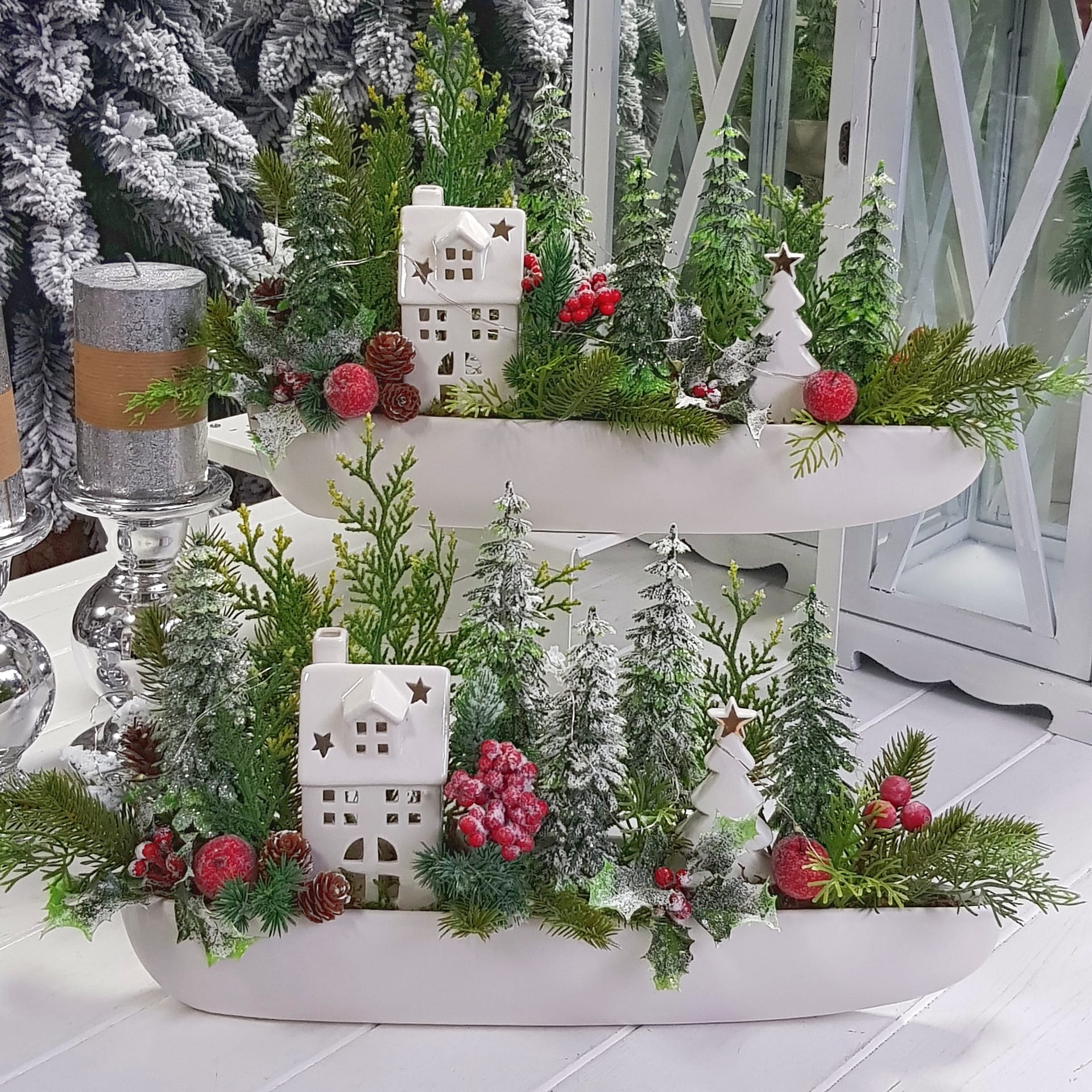 Kompozycja stroik świąteczny choinka biały domek światełka