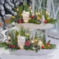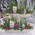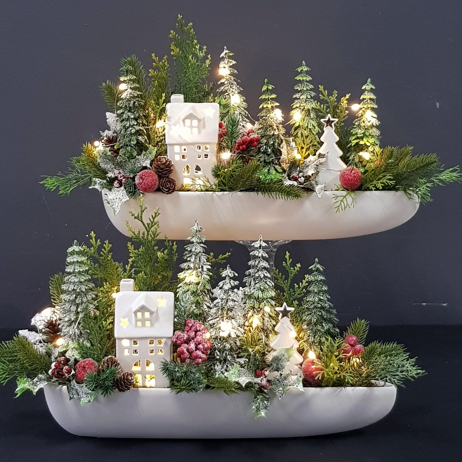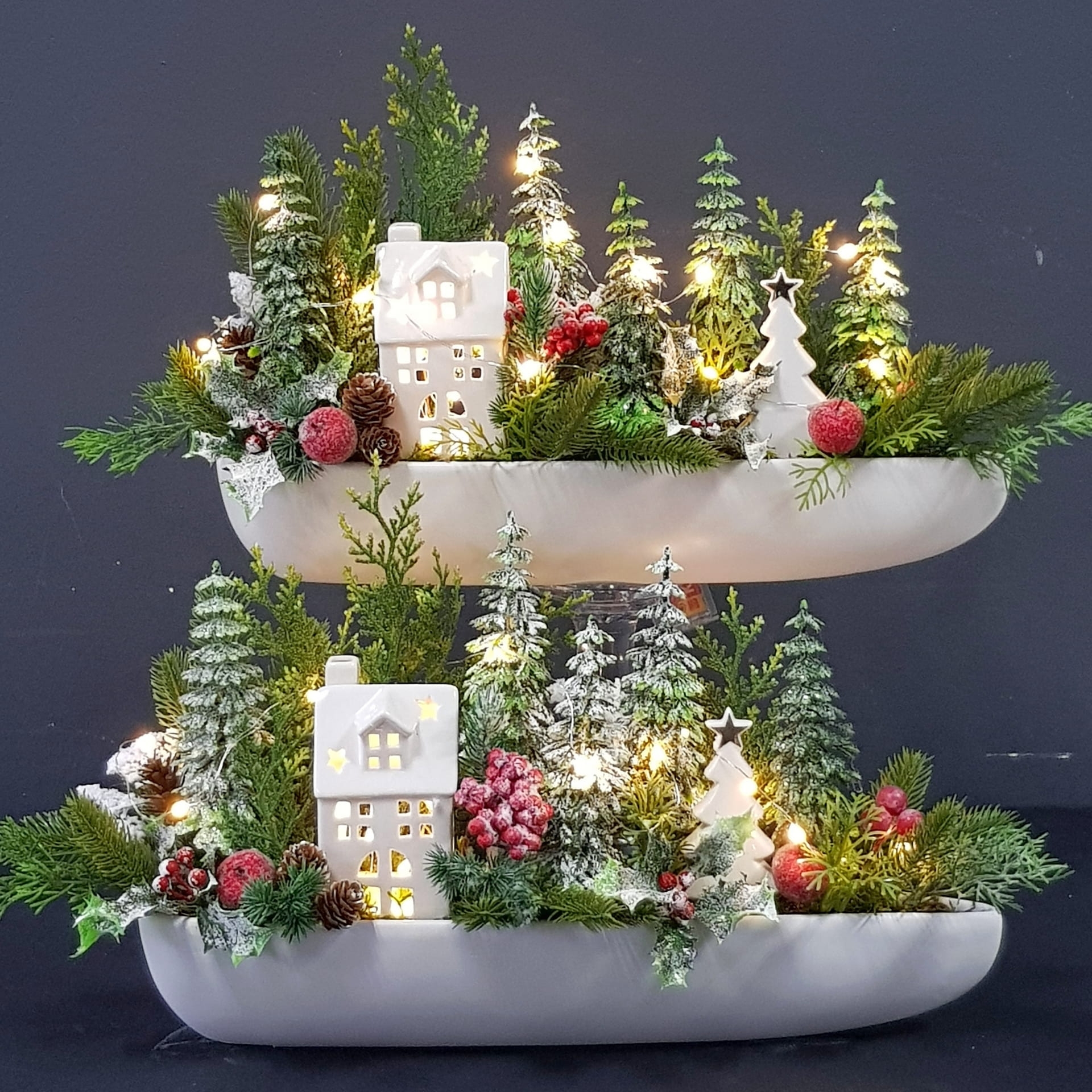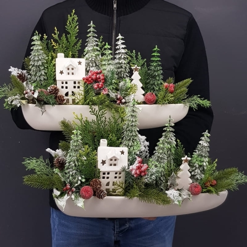 Oryginalna, zimowa kompozycja dekoracyjna wykonana z wysokiej jakości roślin sztucznych oraz dodatków, umieszczona w długiej, ceramicznej donicy. Szczególnego uroku dodają jej ceramiczny domek oraz choinka z gwiazdką. Całość jest wykonana z dbałością o najdrobniejszy szczegół. Rośliny i dodatki są dopasowane kolorystycznie tak, aby tworzyły spójną całość. Idealna do mieszkania, na prezent lub do sesji fotograficznych. Światełka LED wraz z bateriami są również dołączone do kompozycji.