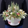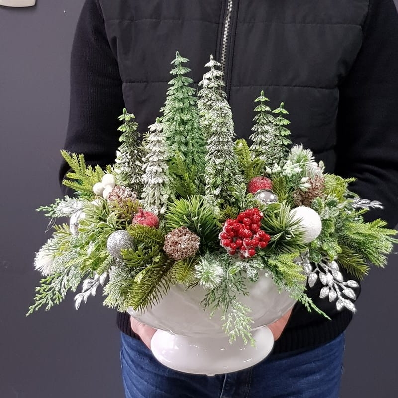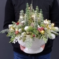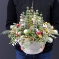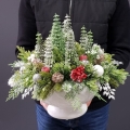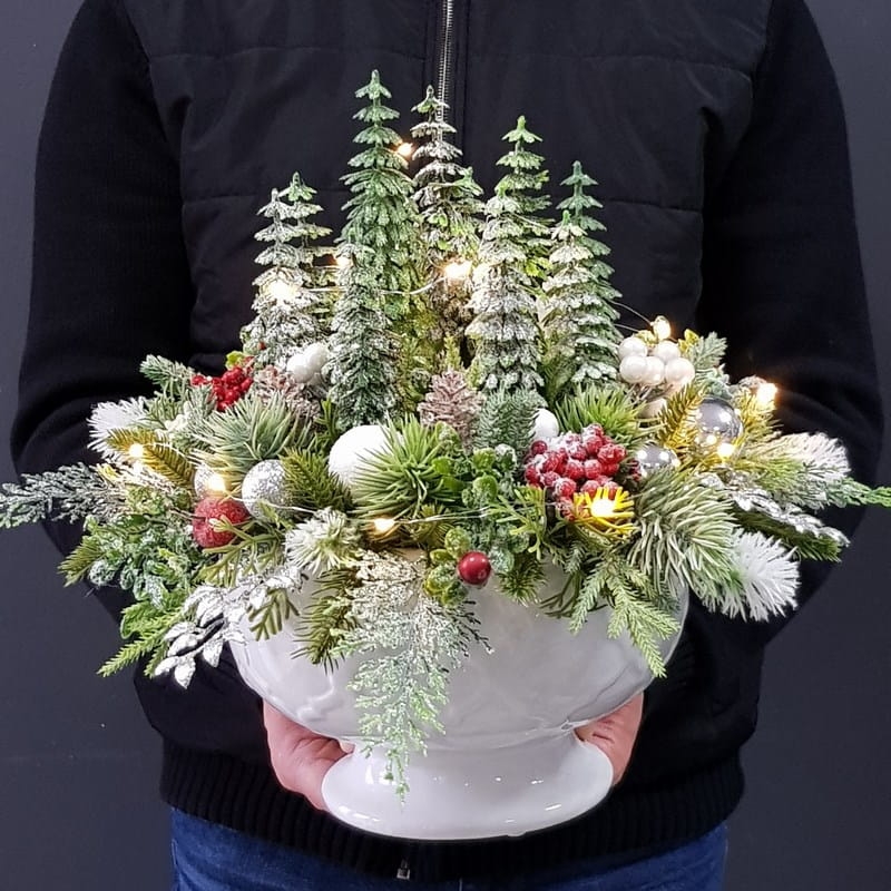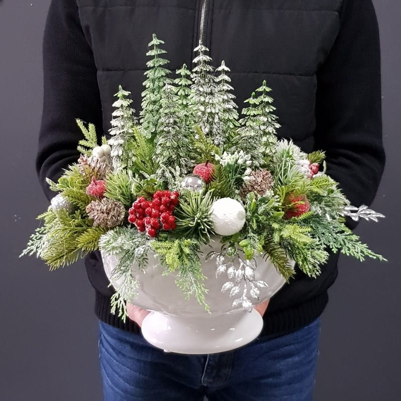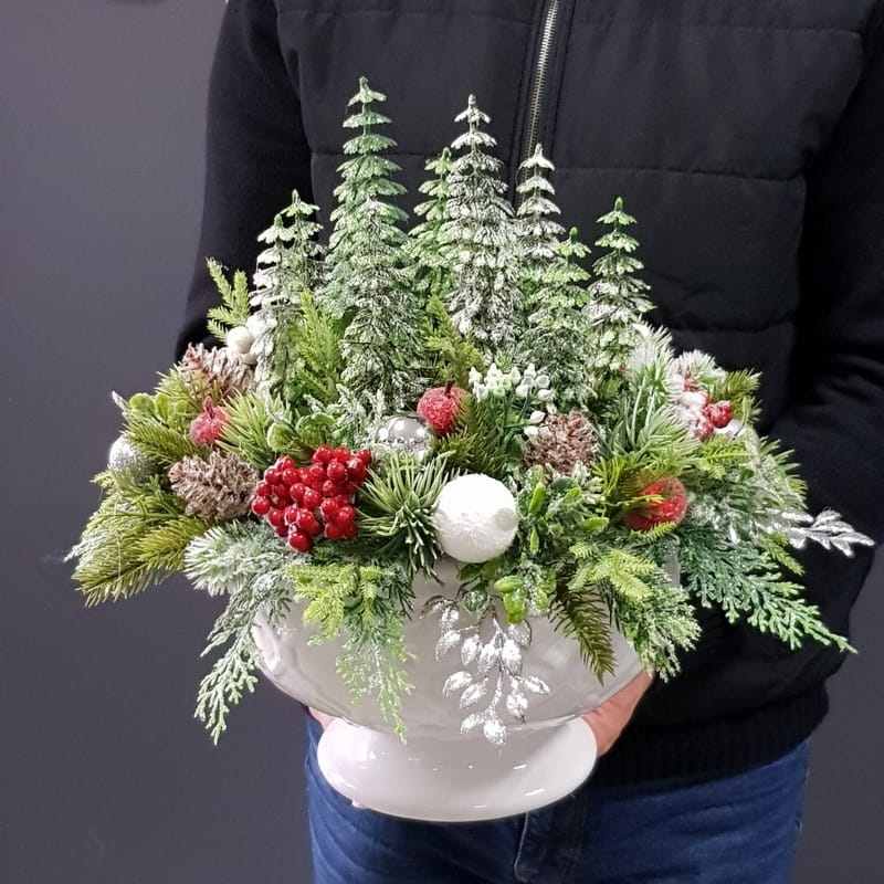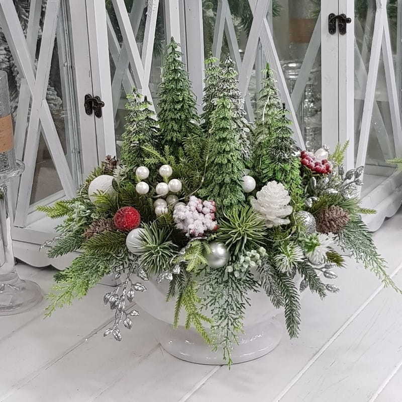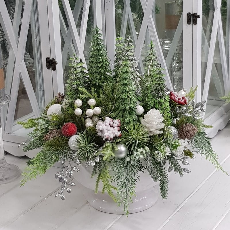 Oryginalna, zimowa kompozycja dekoracyjna wykonana z wysokiej jakości roślin sztucznych, umieszczona w ceramicznej donicy. Całość jest wykonana z dbałością o najdrobniejszy szczegół. Rośliny i dodatki są dopasowane kolorystycznie tak, aby tworzyły spójną całość. Idealna do mieszkania, na prezent lub do sesji fotograficznych.