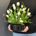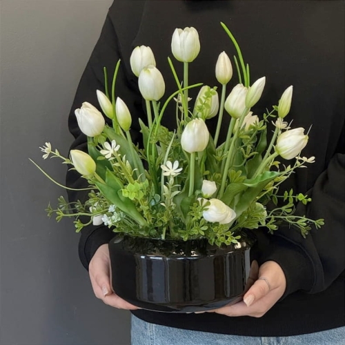 Kompozycja z kwiatów sztucznych została umieszczona w czarnej, okrągłej donicy o gładkiej, eleganckiej powierzchni. Głównym elementem dekoracji są białe tulipany o rozchylonych płatkach, które nadają aranżacji lekkości i naturalnego wyglądu. Kwiaty zostały rozmieszczone w sposób harmonijny, z delikatnym zróżnicowaniem wysokości, co sprawia, że całość prezentuje się dynamicznie, a jednocześnie estetycznie.