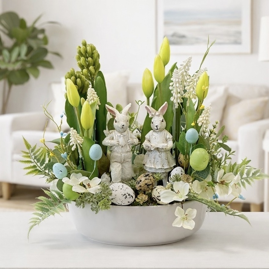 Kompozycja wielkanocna w okrągłej doniczce z z dwoma zajączkami dziewczynką i chłopcem w naturalnej kolorystyce emanuje świeżością i wiosenną prostotą. Wokół cebuli kwiatowej znajdują się dekoracyjne akcenty, takie jak mech w odcieniach zieleni, który podkreśla naturalny charakter kompozycji.