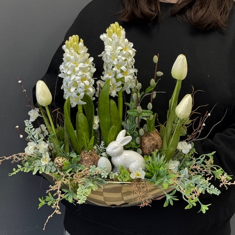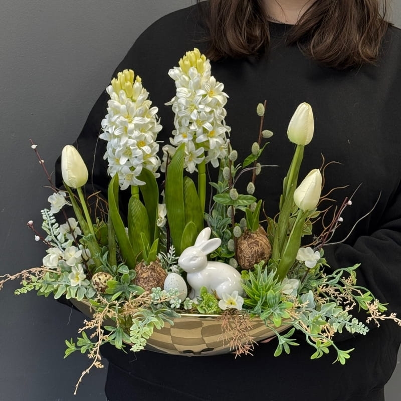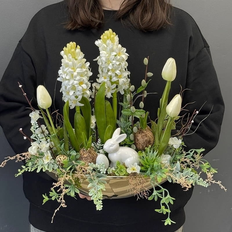 Wiosenna kompozycja umieszczona w złotej, błyszczącej donicy w kształcie łódki, która nadaje całości elegancki i nowoczesny charakter. Centralnym elementem aranżacji jest figurka zająca, subtelnie wkomponowana w otoczenie, tworząca wiosenny, harmonijny nastrój.