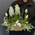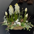 Dominującą kolorystykę stanowią biel i zieleń, które wprowadzają świeżość oraz naturalny wygląd. W kompozycji wykorzystano piękne hiacynty oraz ich cebulki, dodające subtelnego uroku i delikatnego kwiatowego akcentu. Zwisające, drobne rośliny nadają całości lekkości, tworząc wrażenie delikatnego, zwiewnego układu. Brązowe akcenty imitujące naturalne elementy przyrody wzbogacają stroik o ciepłe, organiczne detale, podkreślając jego naturalny charakter.