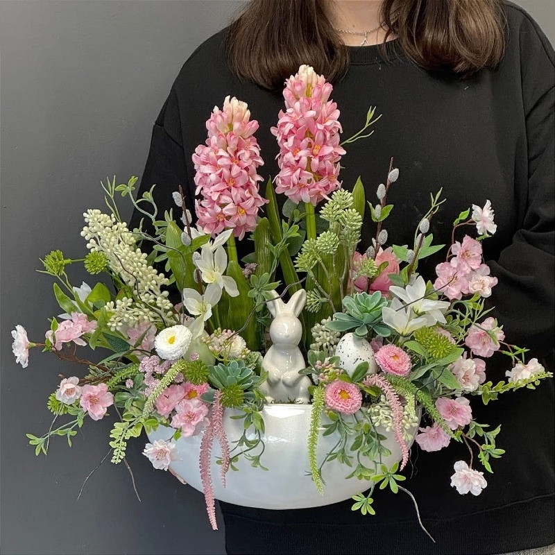 W białej donicy umieszczona została wielkanocna kompozycja ze sztucznych kwiatów, utrzymana w biało-różowo-zielonej kolorystyce. Centralnym elementem aranżacji jest figurka zająca, symbolizująca świąteczny charakter dekoracji. Z tyłu rozmieszczone zostały dwa hiacynty – których kwiatostany dodają kompozycji lekkości i elegancji.