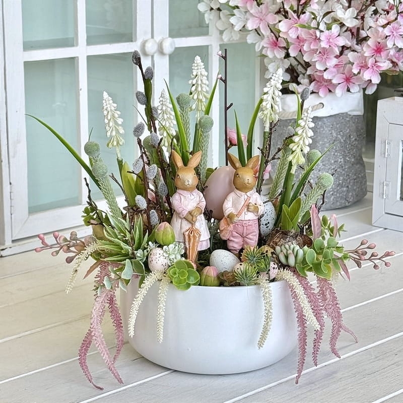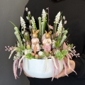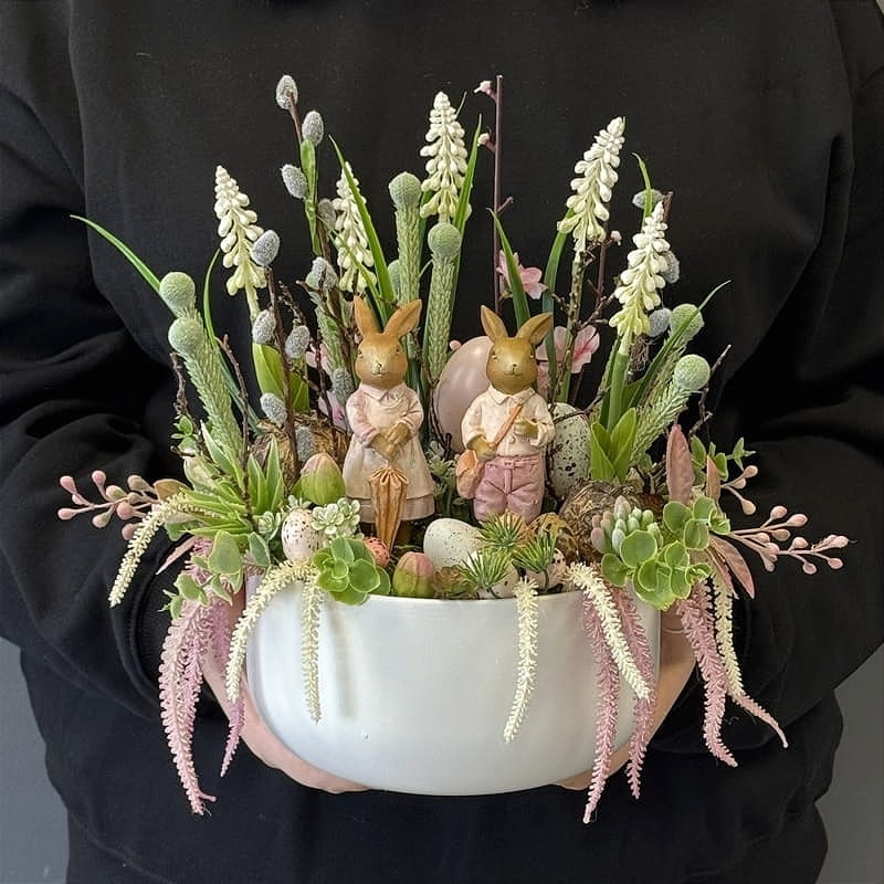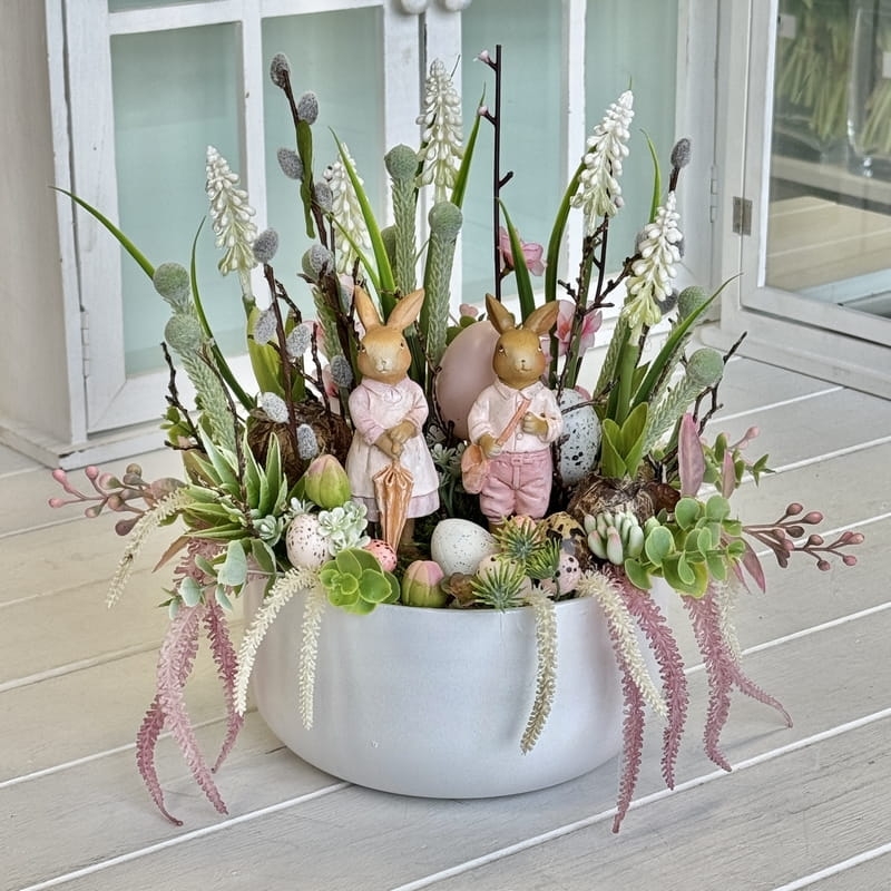 Kompozycja wielkanocna w wysokiej doniczce emanuje delikatnością i wiosennym urokiem. W centralnej części doniczki umieszczona jest para zajączków, wykonanych w pastelowych odcieniach różu, które dodają całości lekkości i subtelnej radości. Zajączki, o prostych, ale eleganckich kształtach, wprowadzają do aranżacji ciepły, świąteczny akcent.