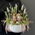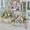 Obok zajączków, w doniczce znajdują się cebulki hiacyntu, które w pastelowych tonach kwitną, a ich delikatne pędy rosną ku górze, wprowadzając świeży i naturalny element. Cebulki subtelnie komponują się z resztą dekoracji, wzbogacając kompozycję o wiosenny zapach i kolor. Wysoka doniczka, o eleganckim wykończeniu, nadaje całości wyrafinowanego charakteru, tworząc harmonijną, pastelową aranżację, idealną na Wielkanoc.