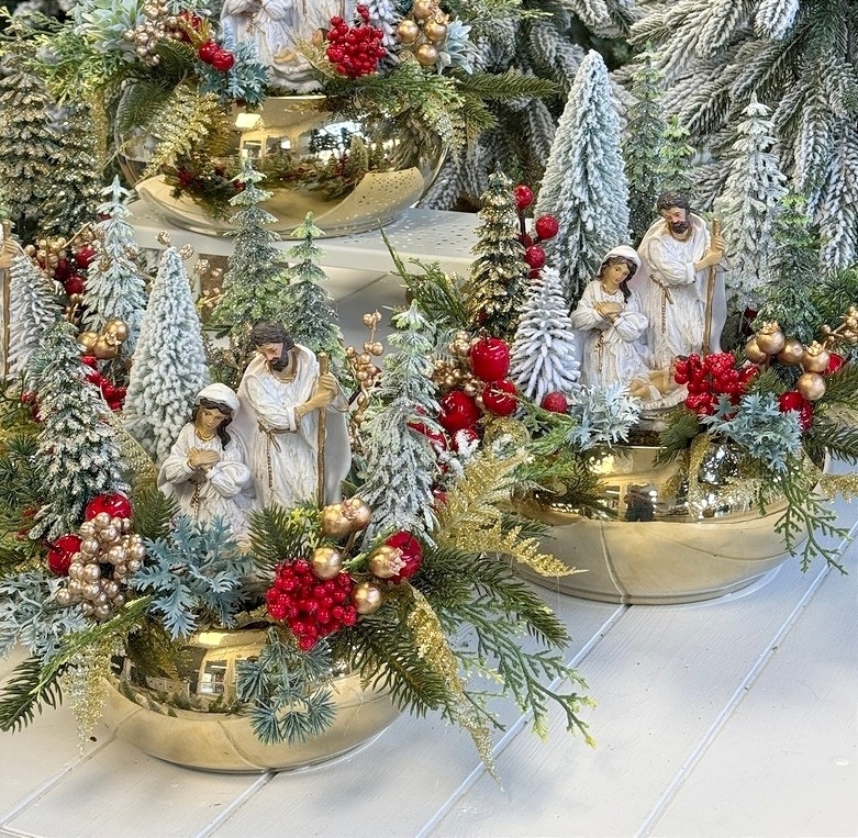 Oryginalna, zimowa kompozycja dekoracyjna wykonana z wysokiej jakości roślin sztucznych, naturalnych szyszek i innych dodatków świątecznych umieszczona w ceramicznej donicy. Szczególnego uroku dodaje jej figurka świętej rodziny w centralnym punkcie stroika. Wszystkie elementy są idealnie dopasowane kolorystycznie tak, aby tworzyły spójną całość. Poszczególne kompozycje mogą minimalnie różnić się rozkładem i rodzajami kwiatów, w zależności od dostępności, jednak kolorystyka i efekt końcowy są zawsze zachowane.