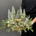 Kompozycja świąteczna z reniferem w złotej donicy to elegancka dekoracja bożonarodzeniowa idealna do stworzenia przytulnego, zimowego klimatu w domu lub biurze. Aranżacja łączy mroźne gałązki świerku, lekko oszronione liście i drobne dodatki w złoto-miedzianej tonacji, które subtelnie połyskują w świetle. Centralnym punktem jest uroczy, matowy renifer – nadający kompozycji wyjątkowy, świąteczny charakter.