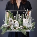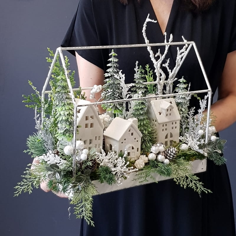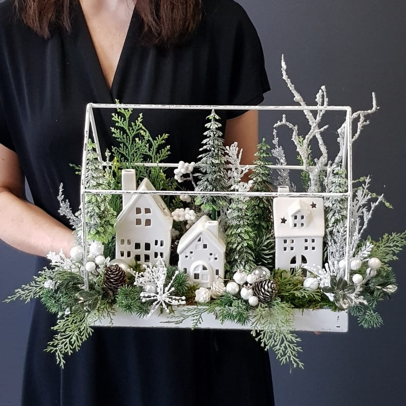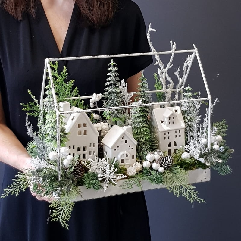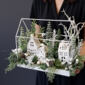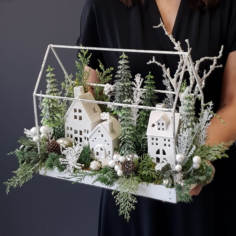 Przepiękna kompozycja z domkami w świątecznym stylu. Podstawa została wykonana z metalu. Dodatki to wysokiej jakości gałązki i ozdoby świąteczne, które zostały połączone w naturalnym stylu. Wszystkie wykorzystywane przez nas elementy to produkty najwyższej jakości, do złudzenia przypominające naturalne rośliny.