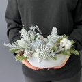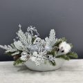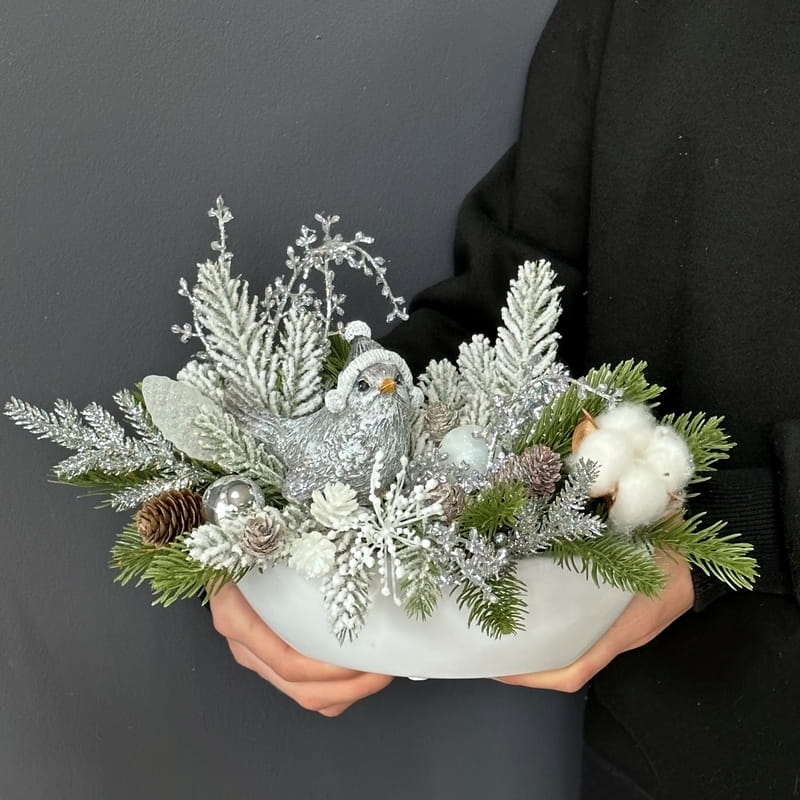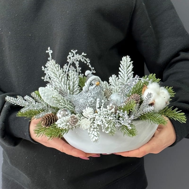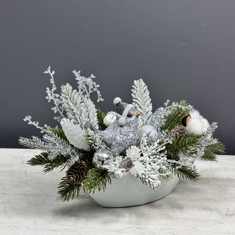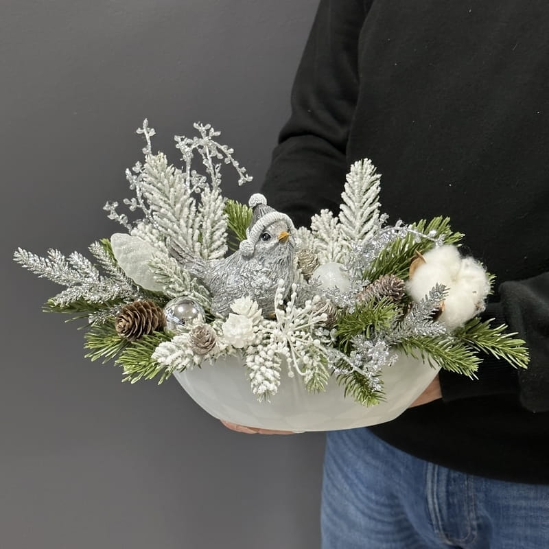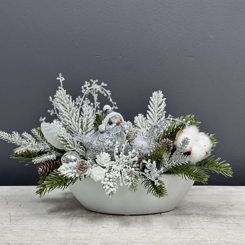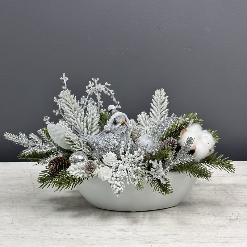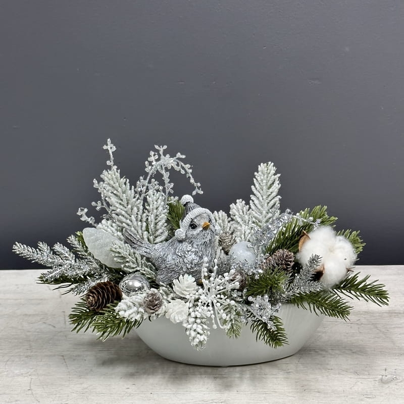 Oryginalna, zimowa kompozycja dekoracyjna wykonana z wysokiej jakości roślin sztucznych oraz dodatków, umieszczona w białej, ceramicznej donicy. Całość jest wykonana z dbałością o najdrobniejszy szczegół. Głównym elementem kompozycji jest figurka ptaszka. Rośliny i dodatki są dopasowane kolorystycznie tak, aby tworzyły spójną całość. Idealna do mieszkania, na prezent lub do sesji fotograficznych.
