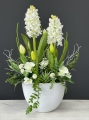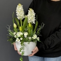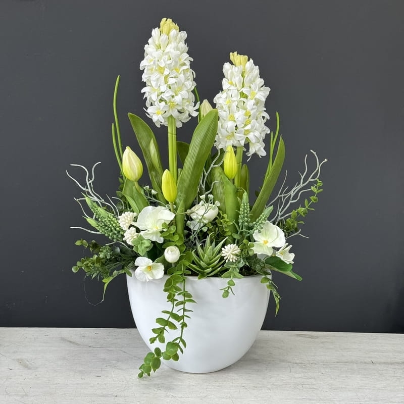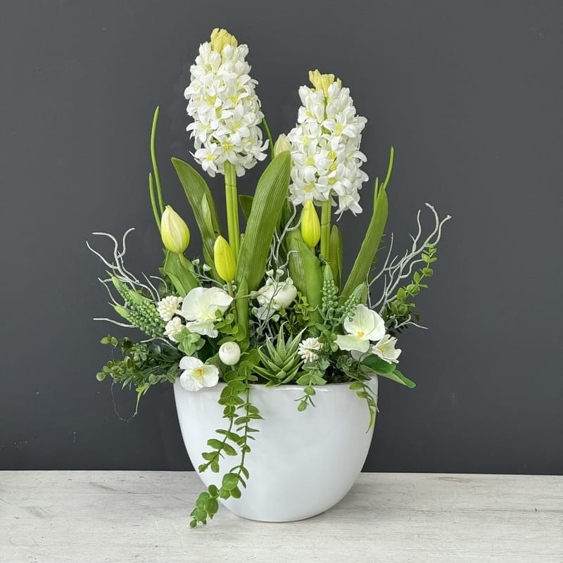 Oryginalna kompozycja roślinna, wykonana z wysokiej jakości hiacyntów, silikonowych tulipanów, zielonych dodatków oraz ceramiki. Idealnie sprawdzi się jako ozdoba mieszkań zarówno w stylu klasycznym, jak i nowoczesnym. Pięknie będzie się prezentowała na komodzie czy parapecie. Polecamy jako oryginalny pomysł na prezent.
