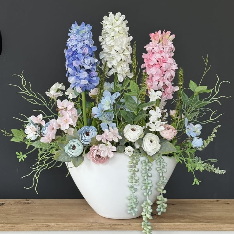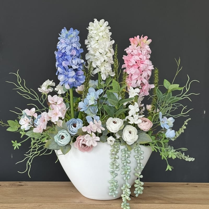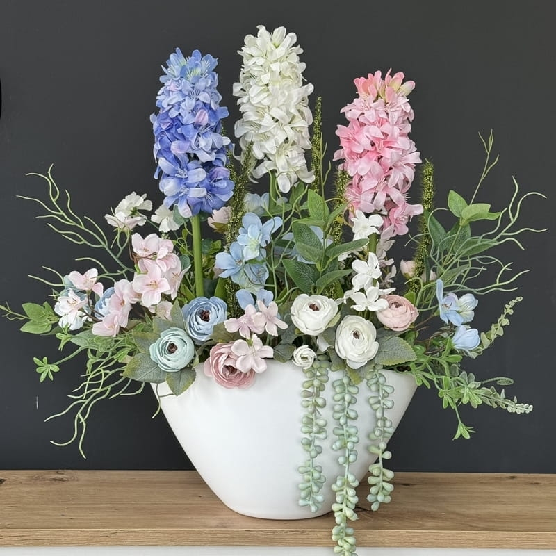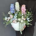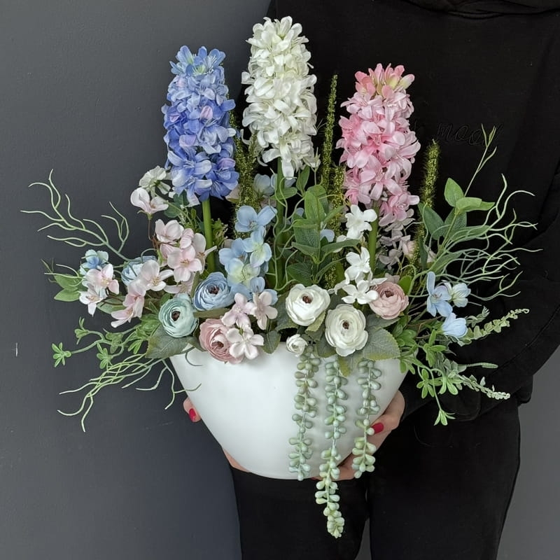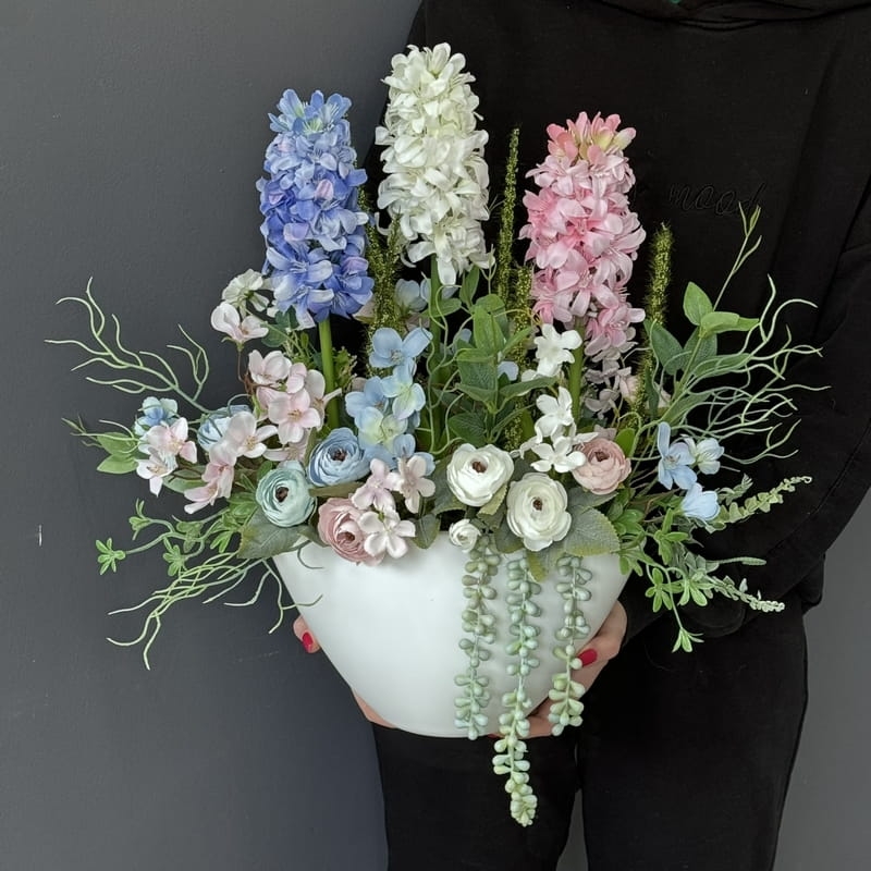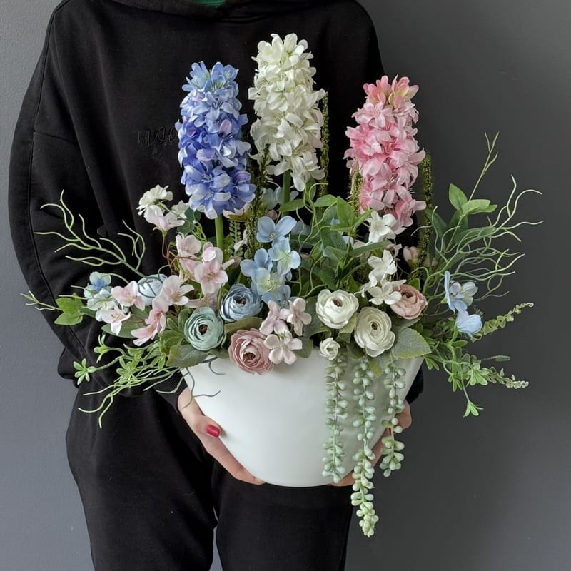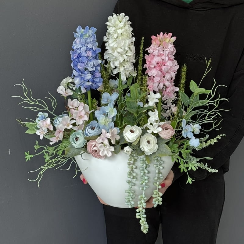 Oryginalna kompozycja roślinna, wykonana z wysokiej jakości hiacyntów, silikonowych tulipanów, zielonych dodatków oraz ceramiki. Idealnie sprawdzi się jako ozdoba mieszkań zarówno w stylu klasycznym, jak i nowoczesnym. Pięknie będzie się prezentowała na komodzie czy parapecie. Polecamy jako oryginalny pomysł na prezent.