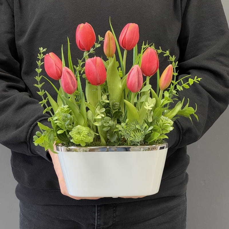 Oryginalna kompozycja roślinna, stworzona się z silikonowych tulipanów umieszczonych w białej, ceramicznej doniczce. Kwiaty zostały starannie rozmieszczone, tworząc harmonijną i naturalnie wyglądającą aranżację. Ich płatki mają delikatnie zaokrąglone krawędzie, a subtelne przejścia kolorystyczne nadają kompozycji realistycznego charakteru.
