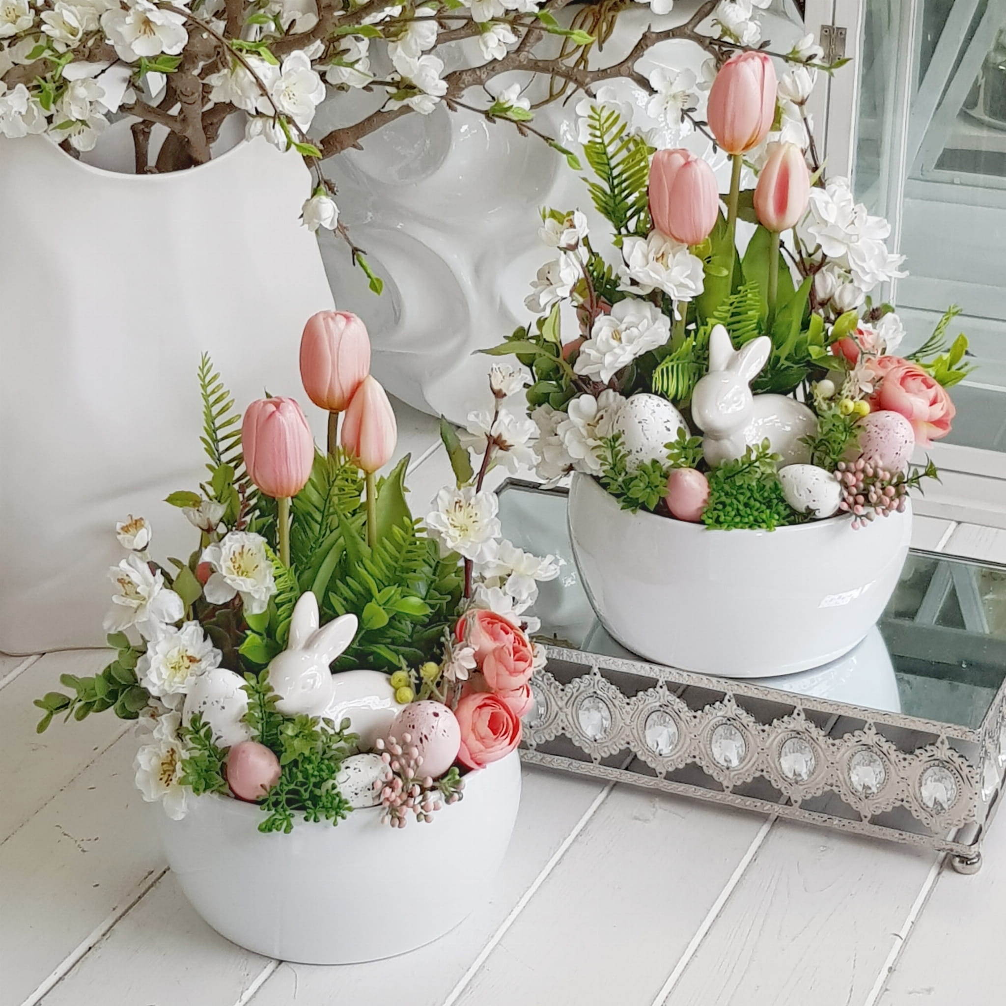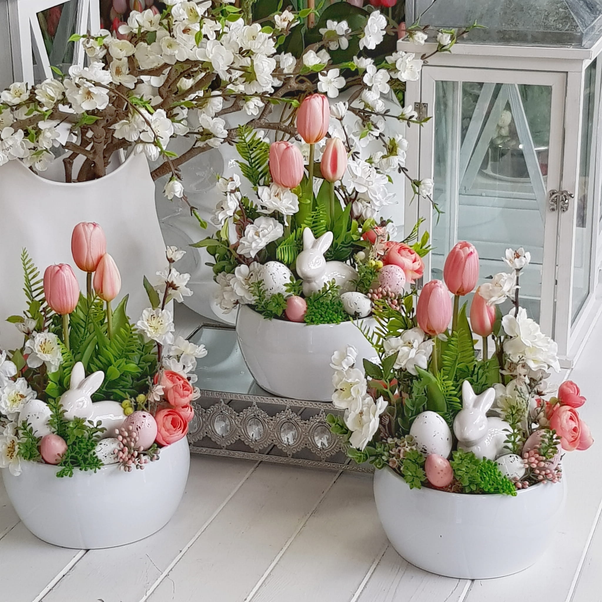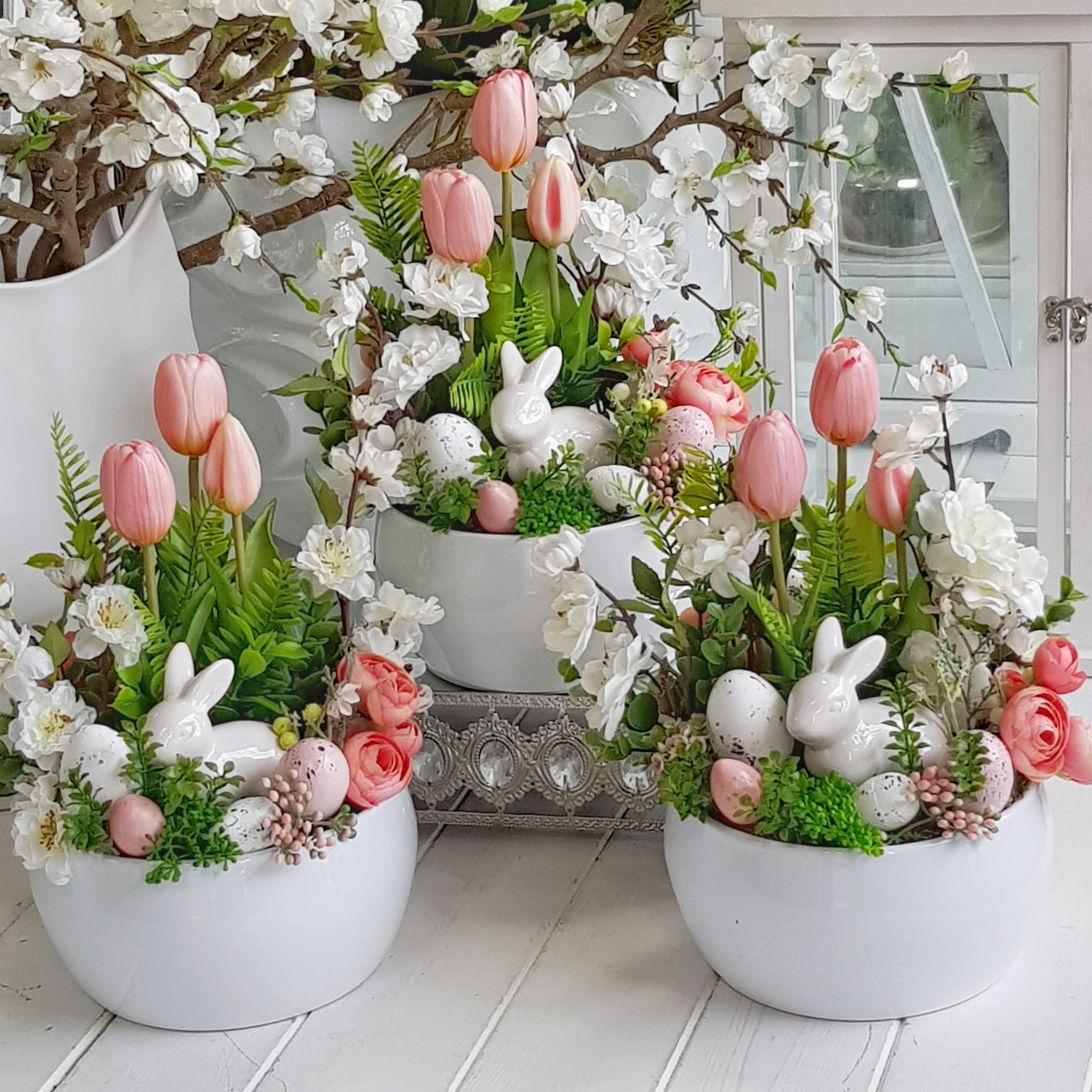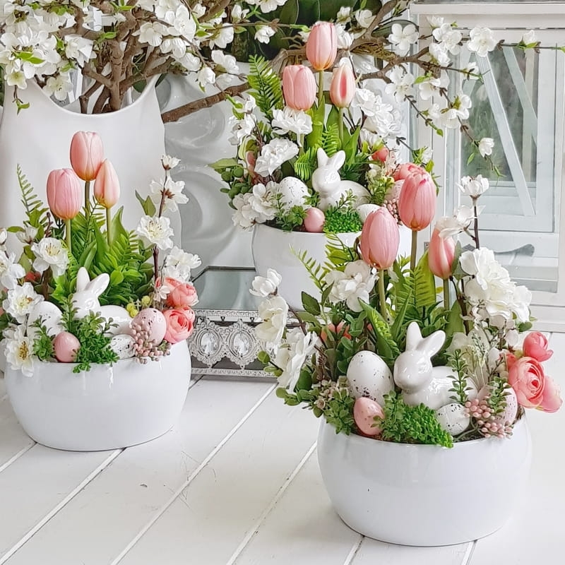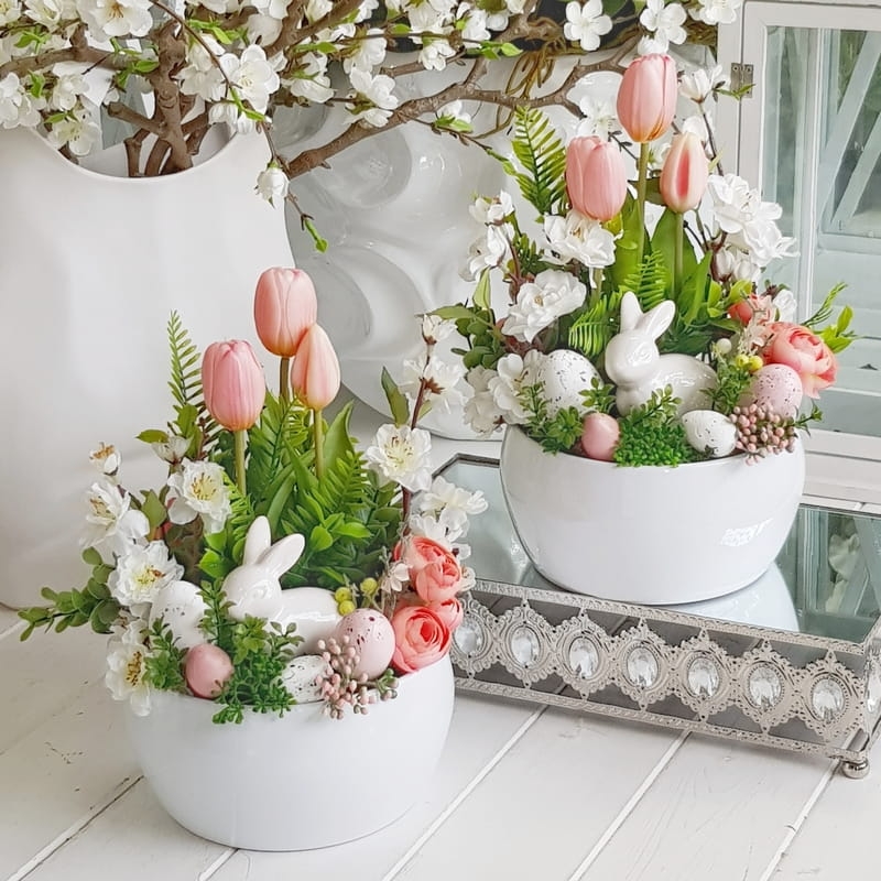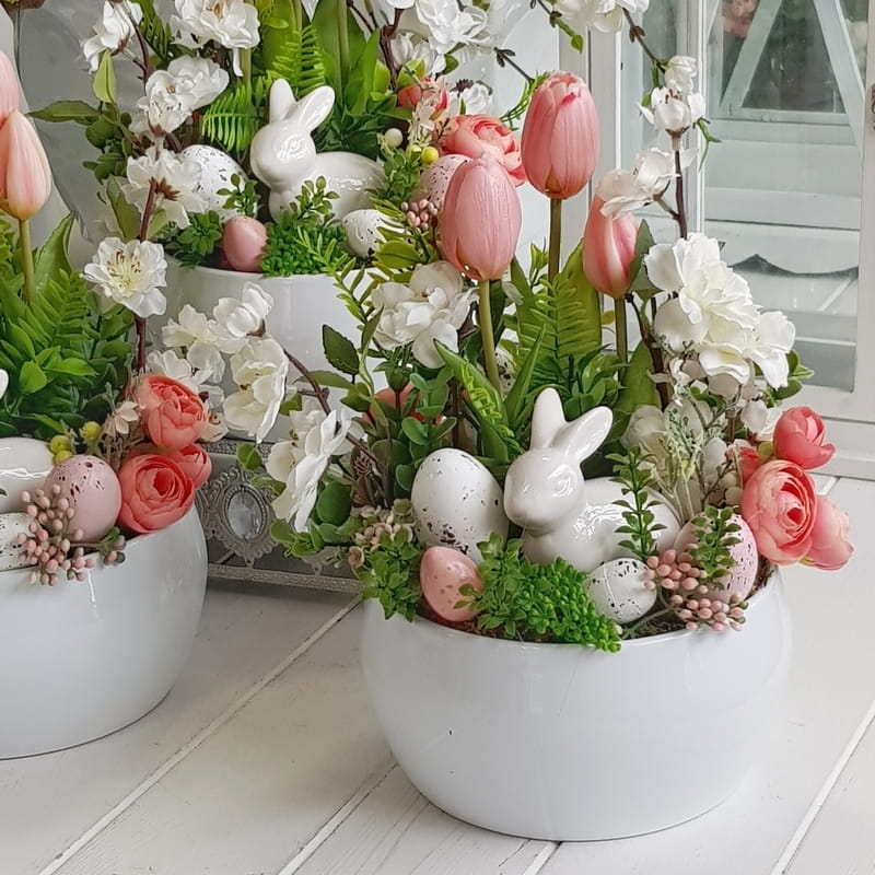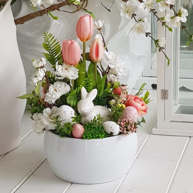 Kompozycja w donicy z zającem misa Milde róż