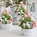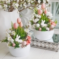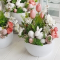 Kompozycja z zajączkiem osadzona w niskiej donicy typu misa. Dostały w niej wykorzystane wiosenne kwiaty i dodatki.