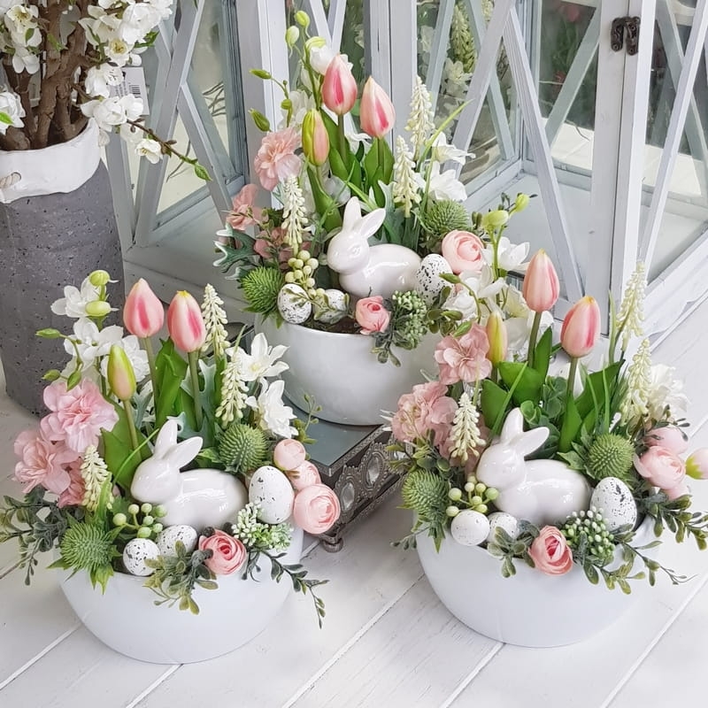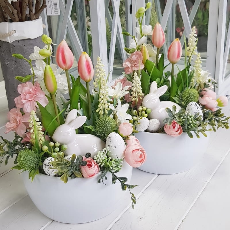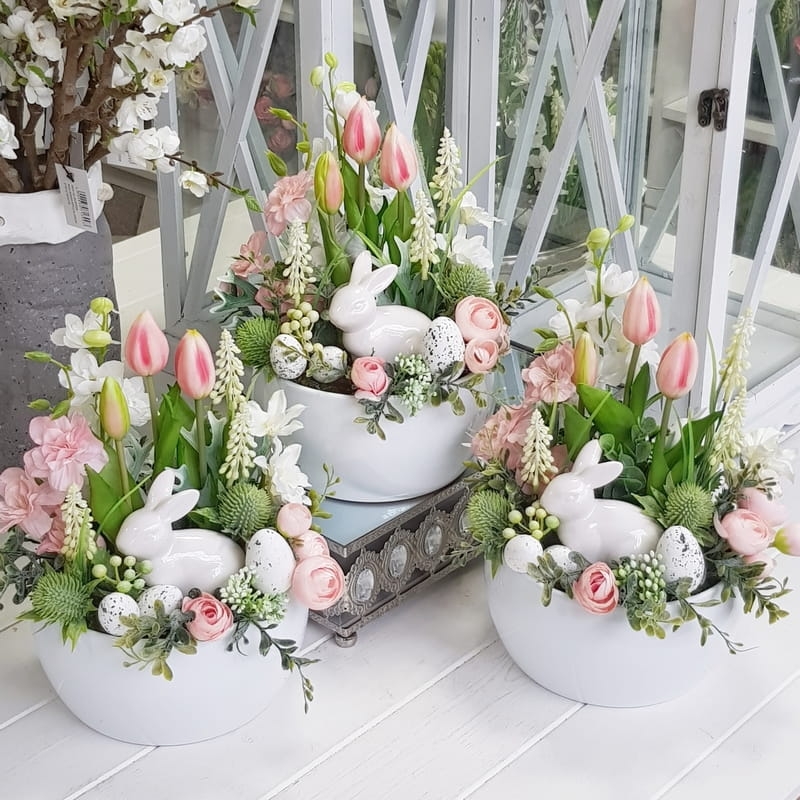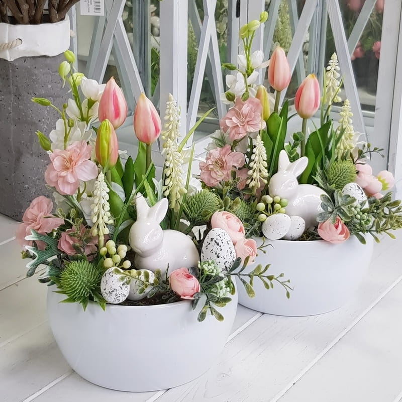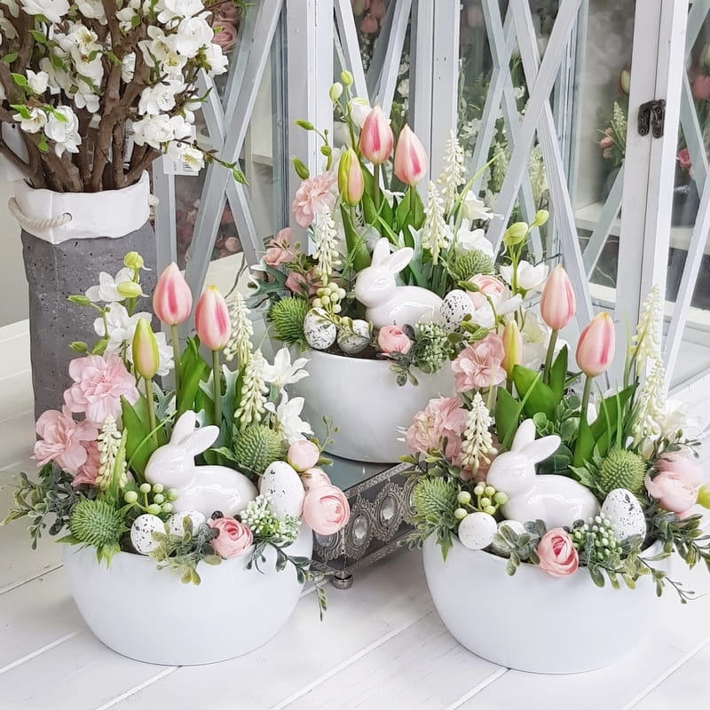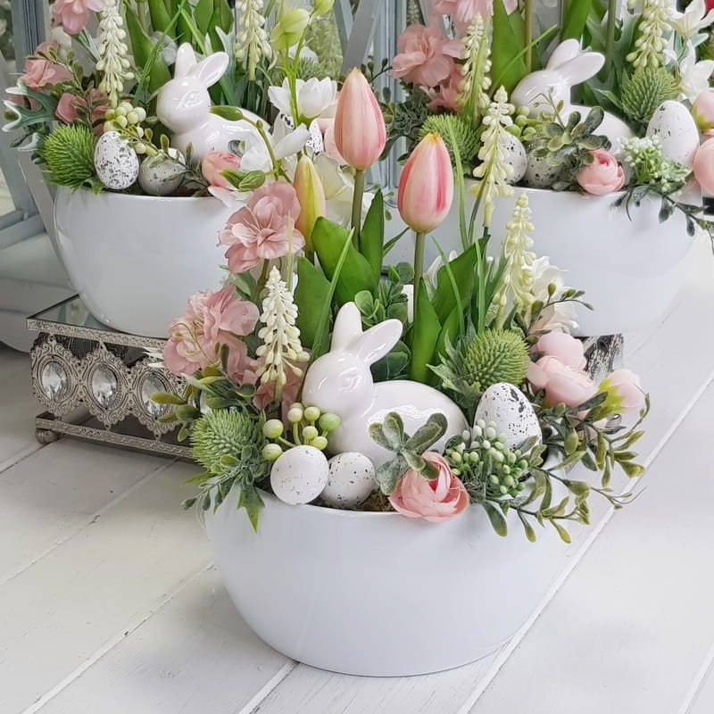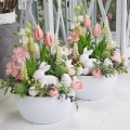 Kompozycja z zajączkiem osadzona w niskiej donicy typu misa. Dostały w niej wykorzystane wiosenne kwiaty i dodatki.