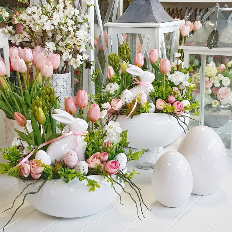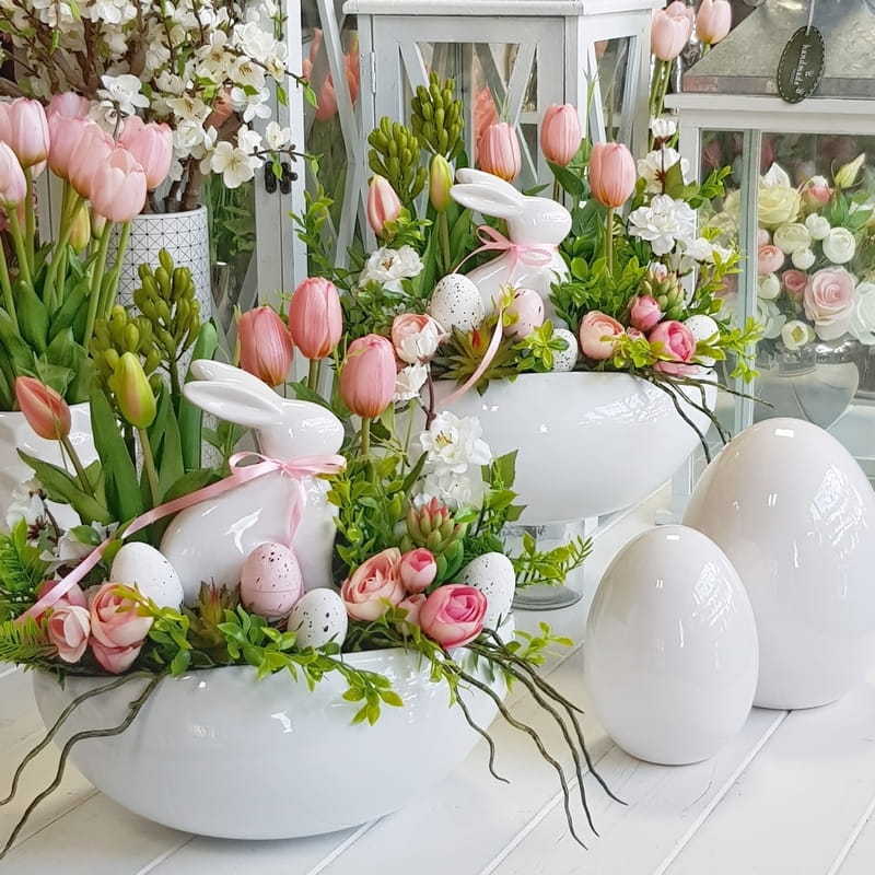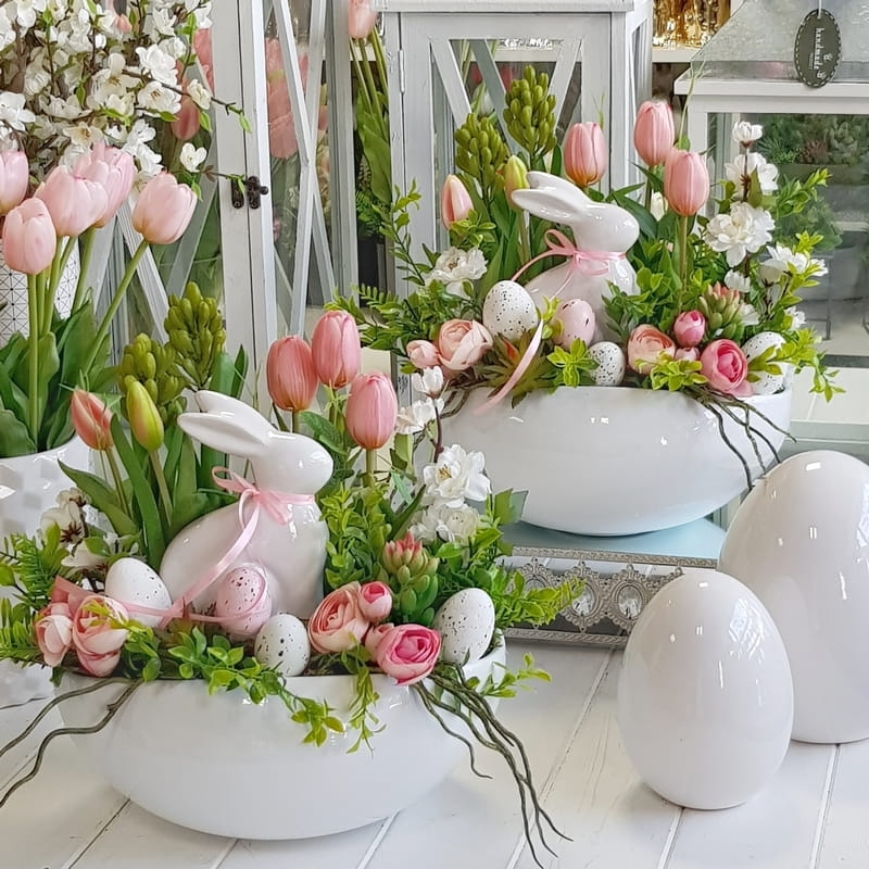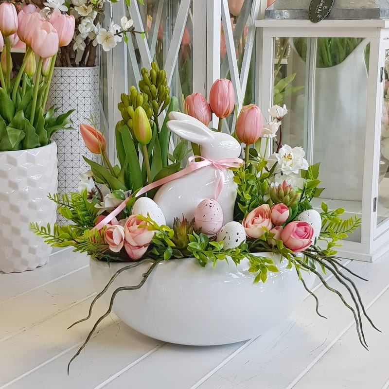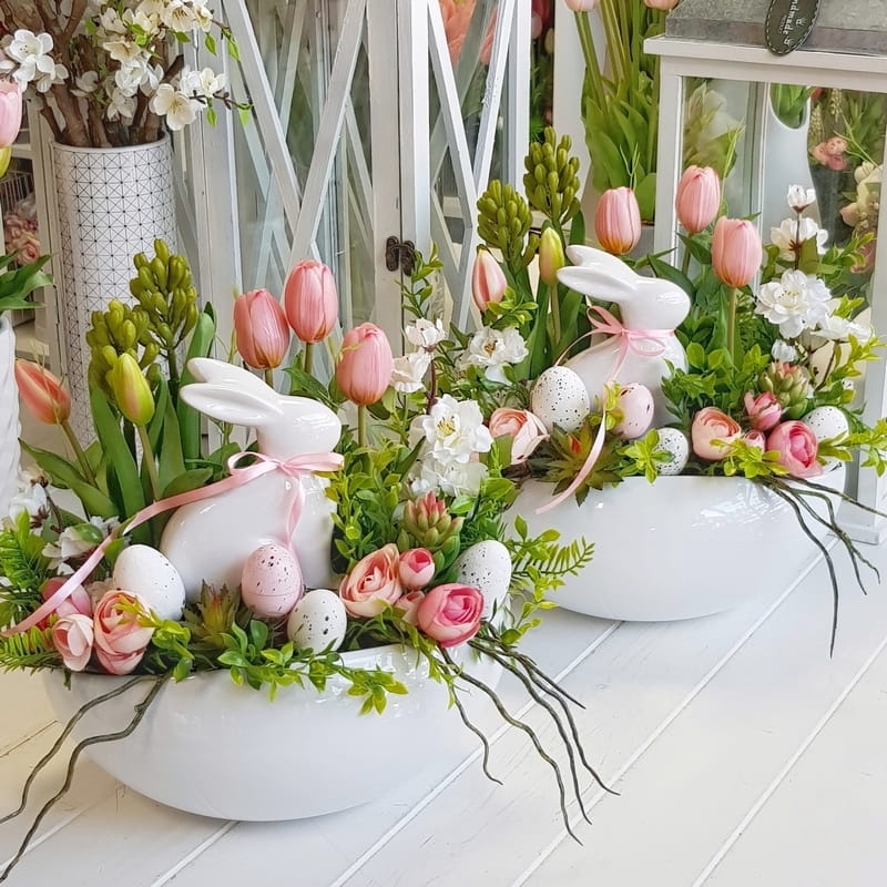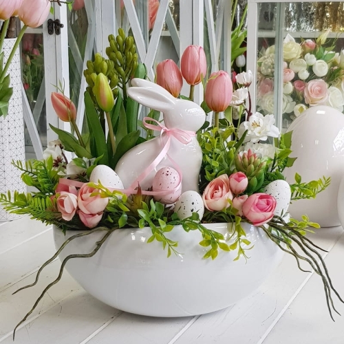 Kompozycja w donicy z zającem owalna misa Eris pink L