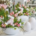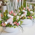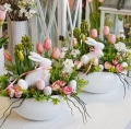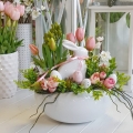 Kompozycja z zajączkiem osadzona w niskiej donicy typu misa. Dostały w niej wykorzystane wiosenne kwiaty i dodatki.