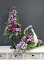 Dekoracja funeralna w postaci zestawu kompozycji na płytę nagrobkową oraz bukietu do wazonu. Postawa wykonana z wikliny, dodatkowo obciążona cementem, wypełniona dużą ilością kwiatów, liści i roślinnych dodatków w przepięknej, stonowanej kolorystyce. Kompozycja ma kształt wrzeciona. Jest wydłużona obustronnie. Dominują kwiaty w stonowanej kolorystyce oraz liście w pastelowej zieleni. Poszczególne kompozycje mogą się różnić rozkładem i rodzajami kwiatów, w zależności od dostępności, jednak kolorystyka i efekt końcowy są zawsze zachowane. Do kompletu został wykonany bukiet w identycznej kolorystyce.