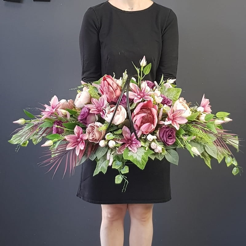 Dekoracja funeralna z metalowym uchwytem w postaci kompozycji na płytę nagrobkową. Postawa wykonana z tworzywa sztucznego, dodatkowo obciążona cementem, wypełniona dużą ilością kwiatów, liści i roślinnych dodatków w przepięknej, stonowanej kolorystyce. Kompozycja ma kształt wrzeciona. Jest wydłużona obustronnie. Dominują kwiaty w stonowanej kolorystyce oraz liście w pastelowej zieleni. Poszczególne kompozycje mogą się różnić rozkładem i rodzajami kwiatów, w zależności od dostępności, jednak kolorystyka i efekt końcowy są zawsze zachowane. Rączka w koszu może być podwójna lub pojedyncza, w zależności od dostępności podstawy.