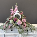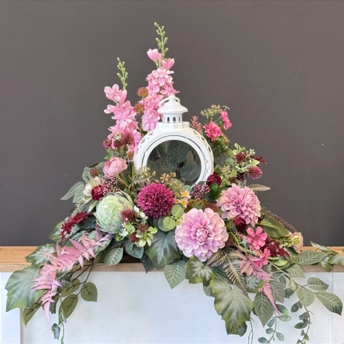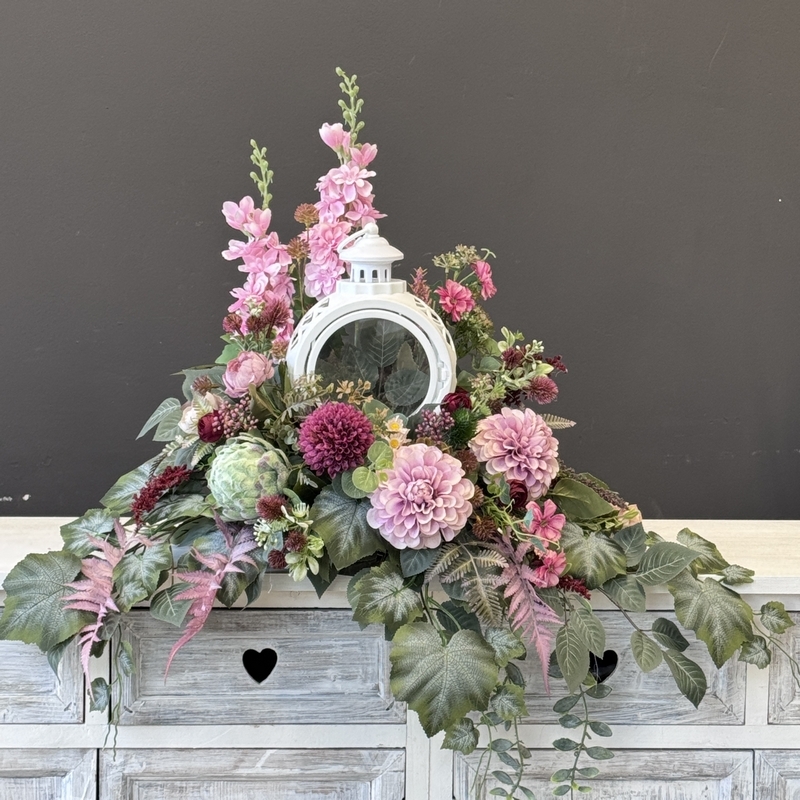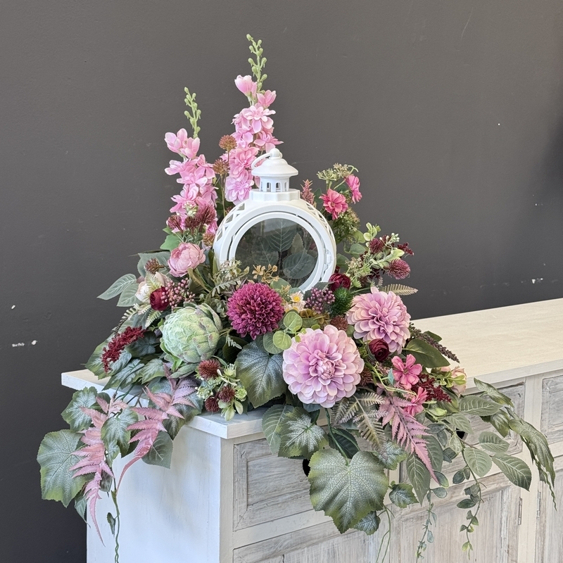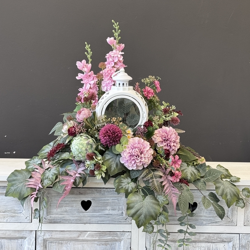 Dekoracja funeralna z latarnią w postaci kompozycji na płytę nagrobkową. Postawa wykonana z tworzywa sztucznego,wypełniona dużą ilością kwiatów, liści i roślinnych dodatków w przepięknej, stonowanej kolorystyce. Dominują kwiaty w stonowanej kolorystyce oraz liście w pastelowej zieleni. Poszczególne kompozycje mogą się różnić rozkładem i rodzajami kwiatów, w zależności od dostępności, jednak kolorystyka i efekt końcowy są zawsze zachowane.