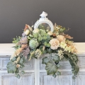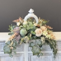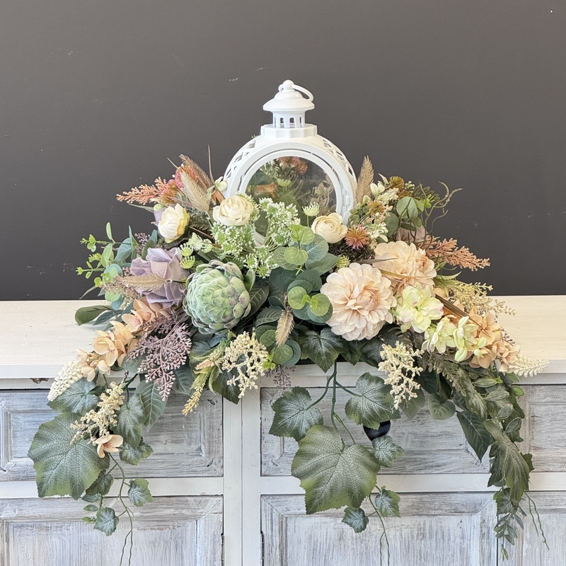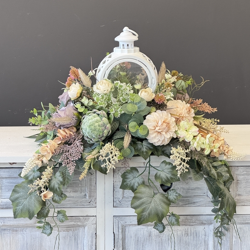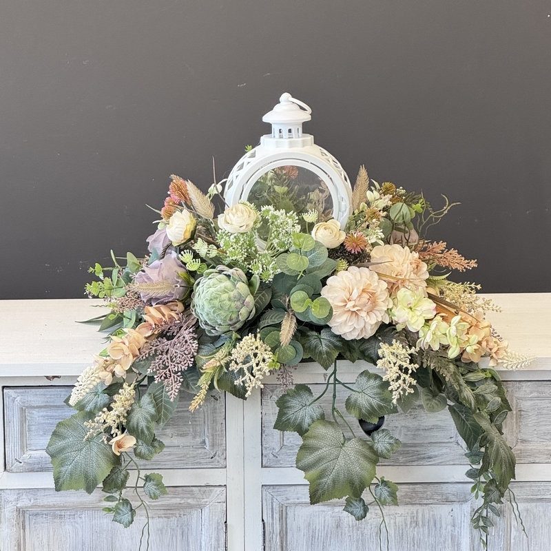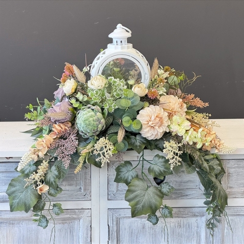 Dekoracja funeralna z latarnią w postaci kompozycji na płytę nagrobkową. Postawa wykonana z tworzywa sztucznego,wypełniona dużą ilością kwiatów, liści i roślinnych dodatków w przepięknej, stonowanej kolorystyce. Dominują kwiaty w stonowanej kolorystyce oraz liście w pastelowej zieleni. Poszczególne kompozycje mogą się różnić rozkładem i rodzajami kwiatów, w zależności od dostępności, jednak kolorystyka i efekt końcowy są zawsze zachowane.