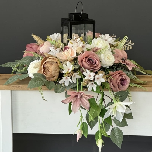 Dekoracja funeralna z latarnią w postaci kompozycji na płytę nagrobkową. Postawa wykonana z tworzywa sztucznego,wypełniona dużą ilością kwiatów, liści i roślinnych dodatków w przepięknej, stonowanej kolorystyce. Kompozycja ma kształt wrzeciona. Jest wydłużona obustronnie. Dominują kwiaty w stonowanej kolorystyce oraz liście w pastelowej zieleni. Poszczególne kompozycje mogą się różnić rozkładem i rodzajami kwiatów, w zależności od dostępności, jednak kolorystyka i efekt końcowy są zawsze zachowane.