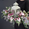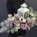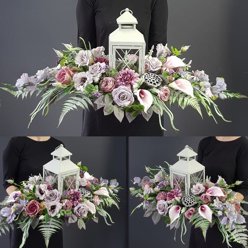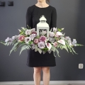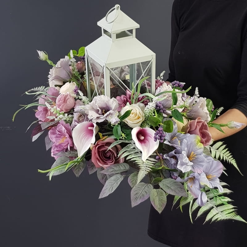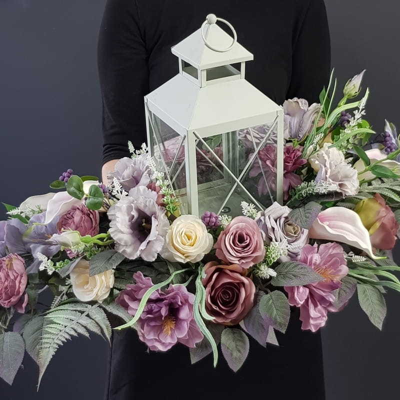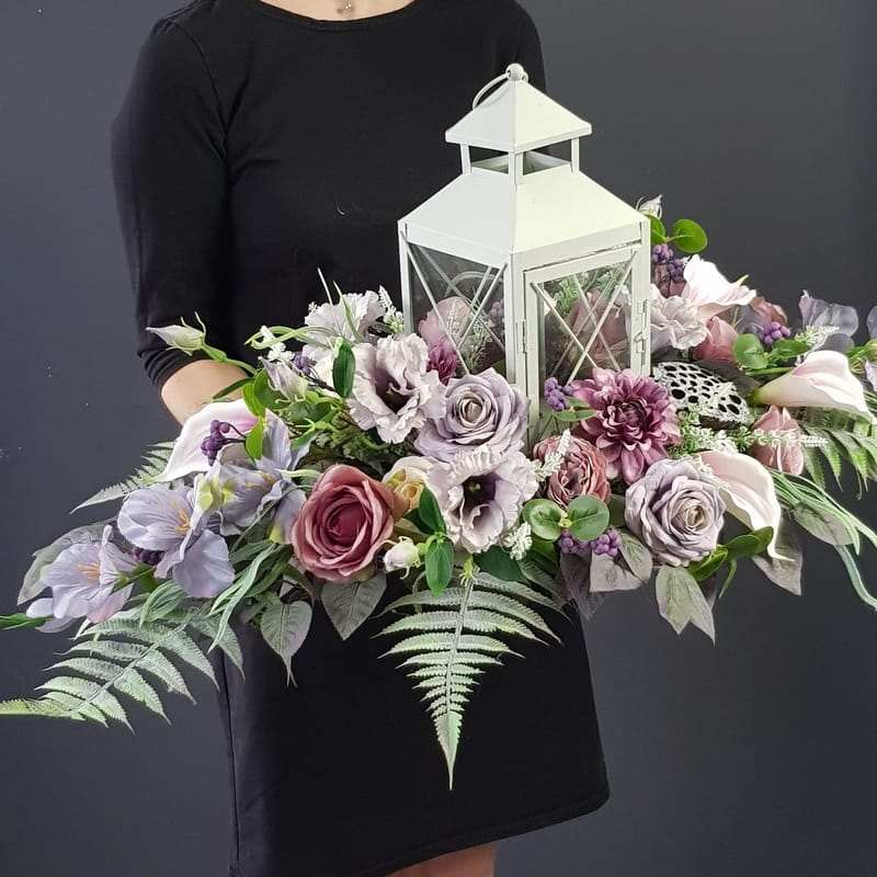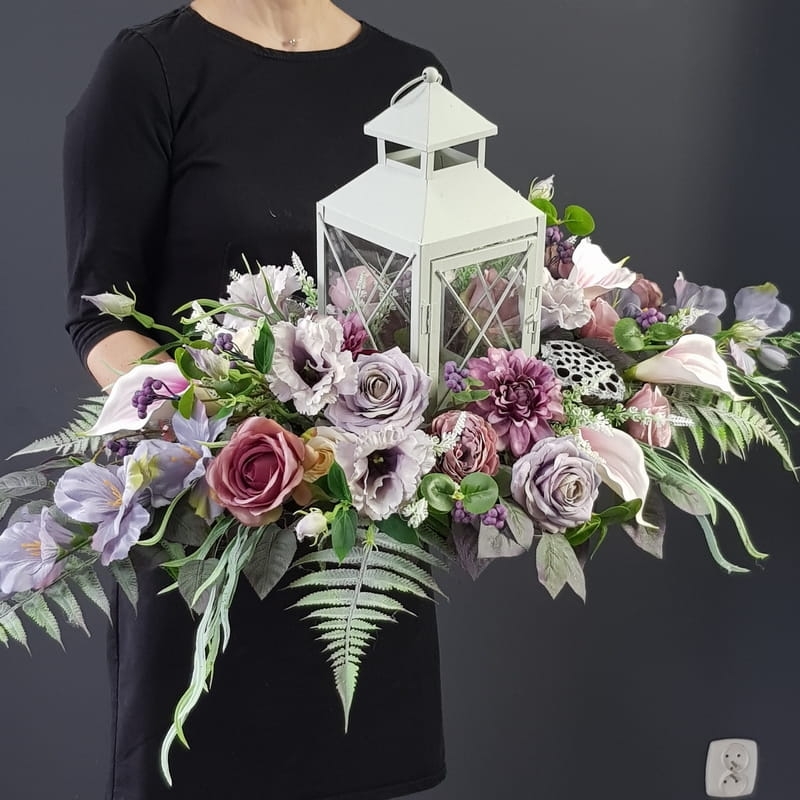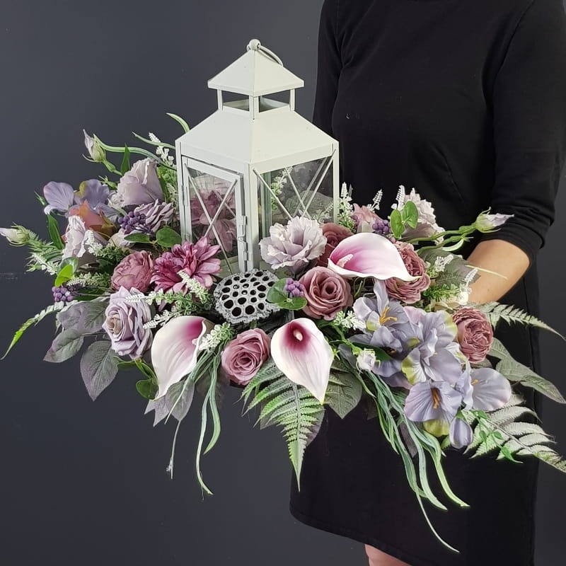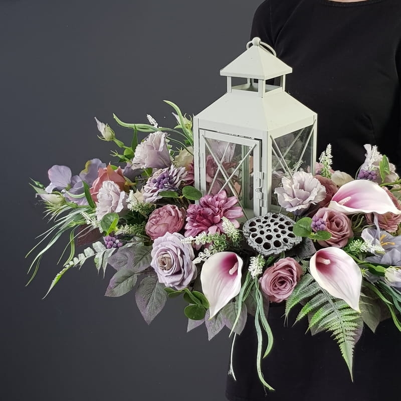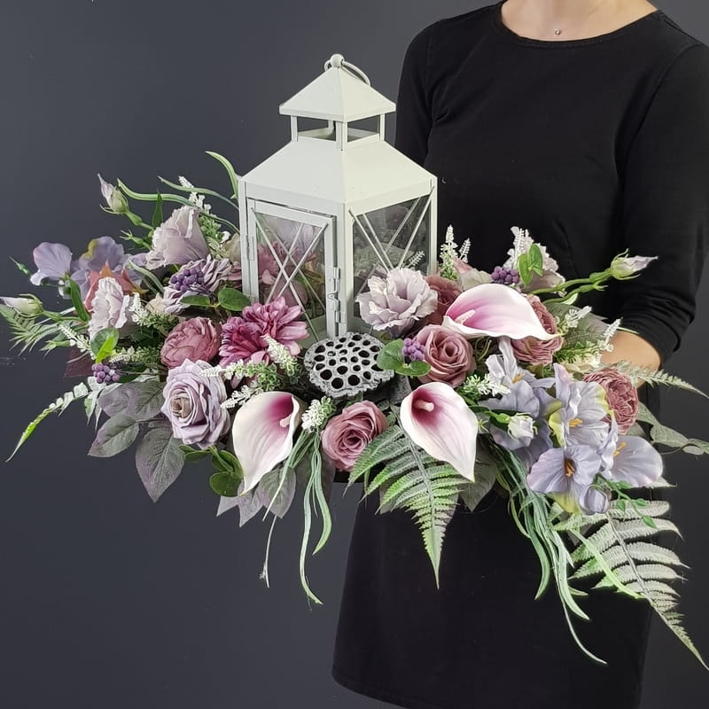 Dekoracja funeralna z latarnią w postaci kompozycji na płytę nagrobkową. Postawa wykonana z tworzywa sztucznego, dodatkowo obciążona cementem, wypełniona dużą ilością kwiatów, liści i roślinnych dodatków w przepięknej, stonowanej kolorystyce. Kompozycja ma kształt wrzeciona. Jest wydłużona obustronnie. Dominują kwiaty w stonowanej kolorystyce oraz liście w pastelowej zieleni. Poszczególne kompozycje mogą się różnić rozkładem i rodzajami kwiatów, w zależności od dostępności, jednak kolorystyka i efekt końcowy są zawsze zachowane.