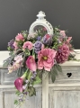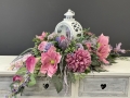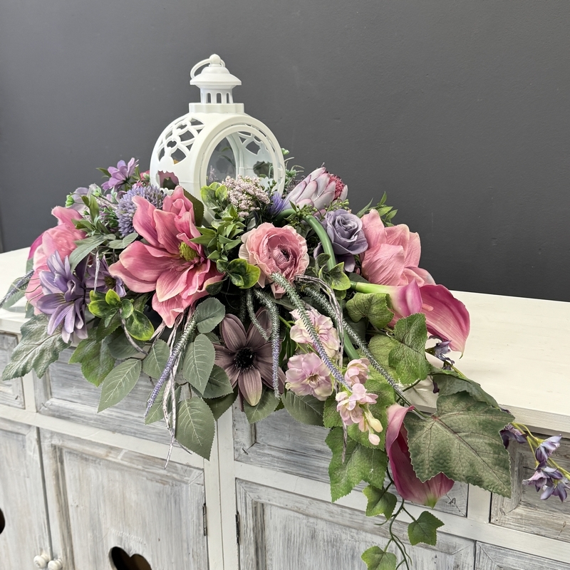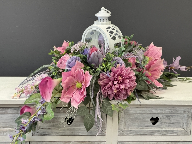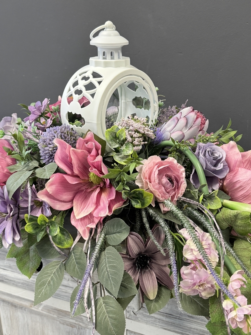 Dekoracja funeralna z latarnią w postaci kompozycji na płytę nagrobkową. Postawa wykonana z tworzywa sztucznego,wypełniona dużą ilością kwiatów, liści i roślinnych dodatków w przepięknej, stonowanej kolorystyce. Kompozycja ma kształt wrzeciona. Jest wydłużona obustronnie. Dominują kwiaty w stonowanej kolorystyce oraz liście w pastelowej zieleni. Poszczególne kompozycje mogą się różnić rozkładem i rodzajami kwiatów, w zależności od dostępności, jednak kolorystyka i efekt końcowy są zawsze zachowane.