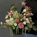 Elegancka kompozycja kwiatowa w donicy o wyrazistym, a jednocześnie harmonijnym charakterze, stworzona z myślą o stylowych aranżacjach wnętrz. Dekoracja została osadzona w nowoczesnej, czarnej donicy, która doskonale podkreśla bogactwo form i kolorów kwiatów. Kompozycja utrzymana jest w szlachetnej palecie barw obejmującej odcienie pudrowego i przydymionego różu, kremowej bieli oraz głębokiej zieleni. W aranżacji wykorzystano różnorodne kwiaty dekoracyjne, m.in. róże, dalie, drobne kwiatostany oraz starannie dobraną zieleń i dekoracyjne gałązki, które nadają całości naturalny, lekko romantyczny wygląd. Zwiewne, opadające elementy roślinne wprowadzają lekkość i przestrzenność, podkreślając nowoczesny charakter kompozycji.