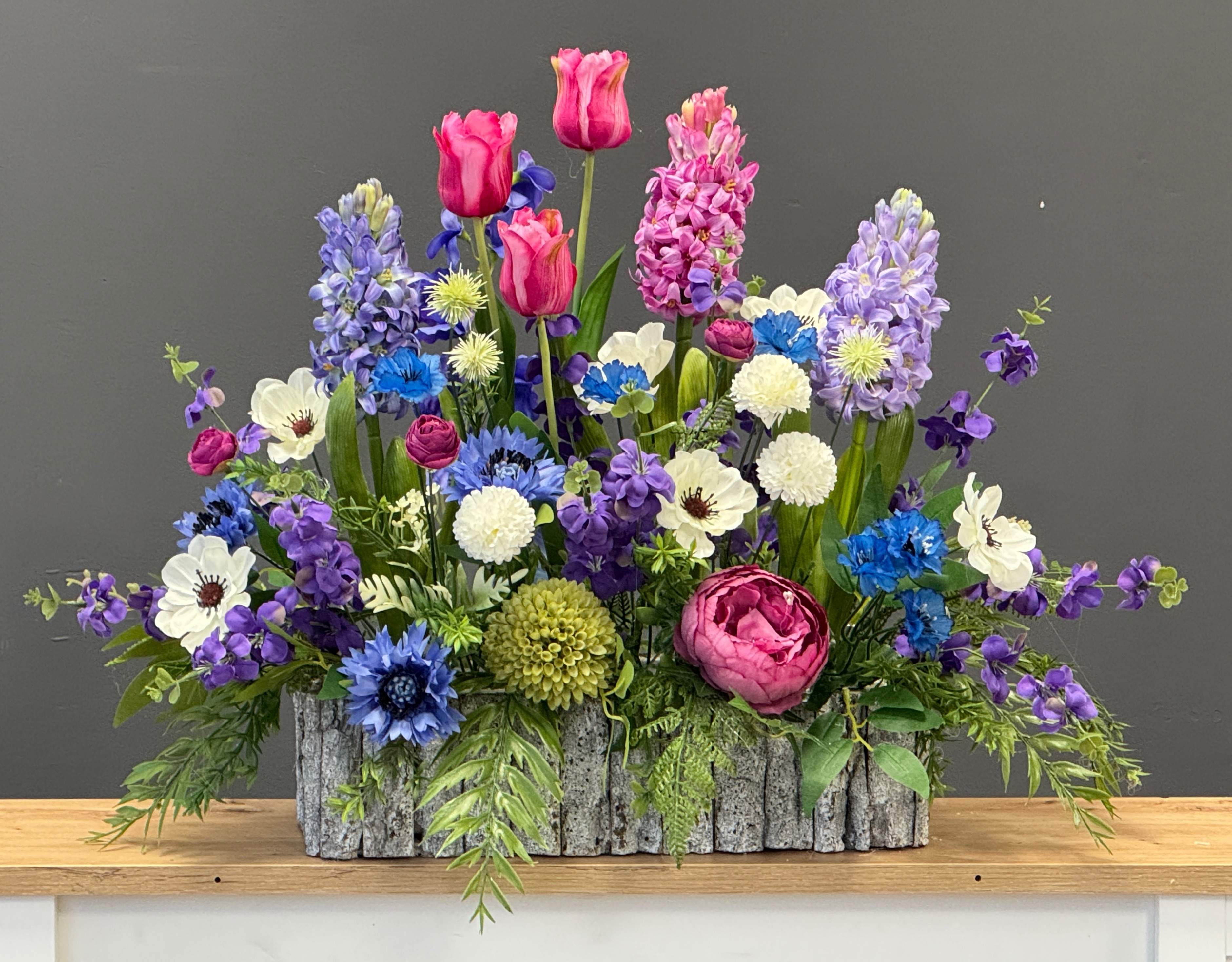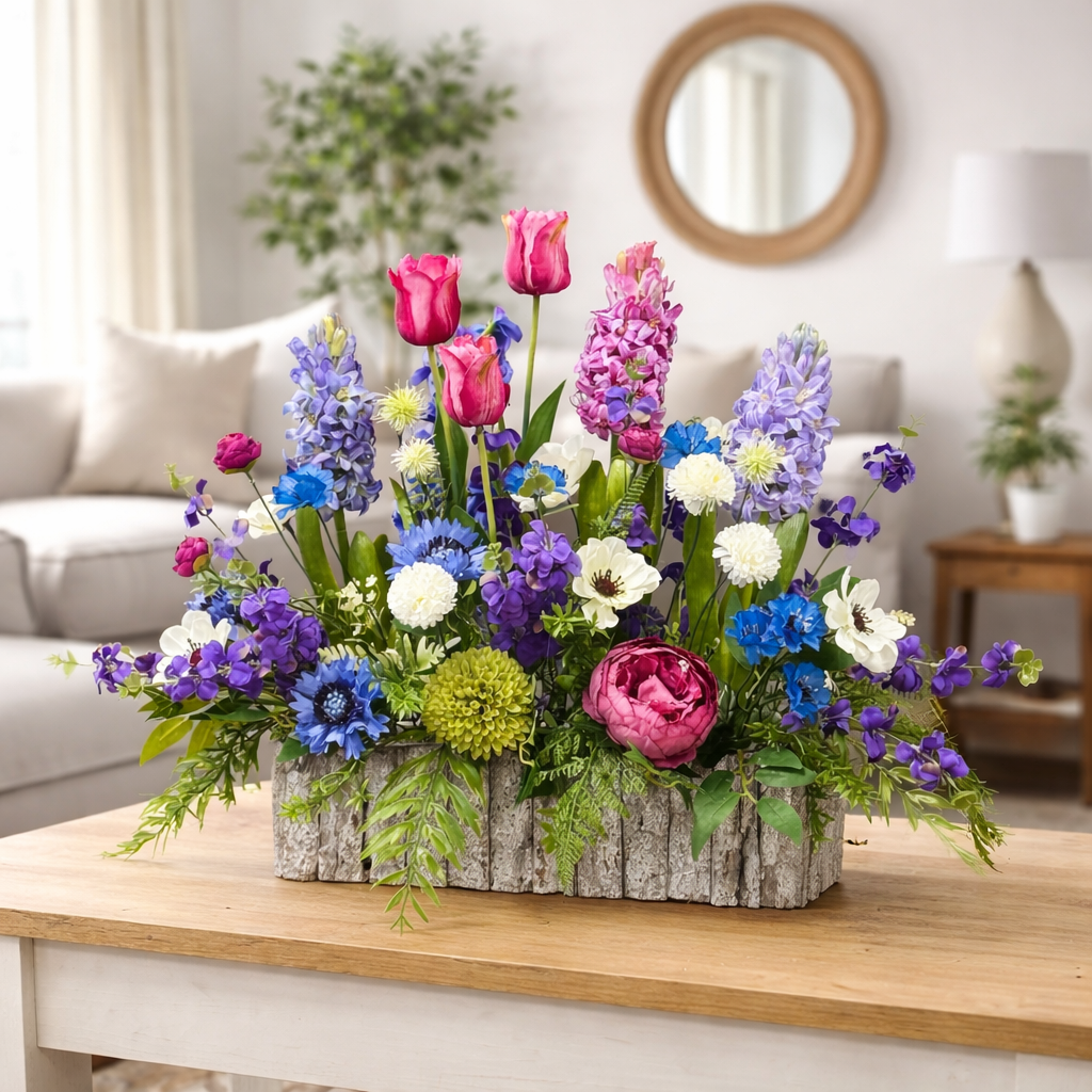 Kompozycja sztucznych kwiatów wiosennych, takich jak hiacynty i tulipany, została wykonana z materiałów wysokiej jakości, wiernie odwzorowujących naturalny wygląd roślin. Kwiaty umieszczono w postarzałej drewnianej donicy wykonanej z kory drewna, która dodaje całości rustykalnego uroku i naturalnego charakteru. Donica została dodatkowo obciążona cementem, co zapewnia stabilność i trwałość kompozycji. Starannie dopracowane detale sprawiają, że dekoracja prezentuje się elegancko i realistycznie.