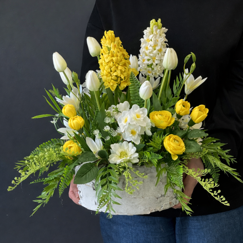 Kompozycja wiosenna kwiaty w donicy ogródek Talis