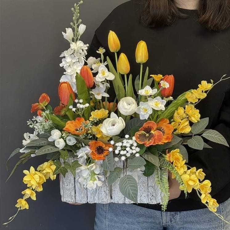Kompozycja sztucznych kwiatów wiosennych, została wykonana z materiałów wysokiej jakości, wiernie odwzorowujących naturalny wygląd roślin. Kwiaty umieszczono w postarzałej drewnianej donicy wykonanej z kory drewna, która dodaje całości rustykalnego uroku i naturalnego charakteru. Donica została dodatkowo obciążona cementem, co zapewnia stabilność i trwałość kompozycji. Starannie dopracowane detale sprawiają, że dekoracja prezentuje się elegancko i realistycznie.